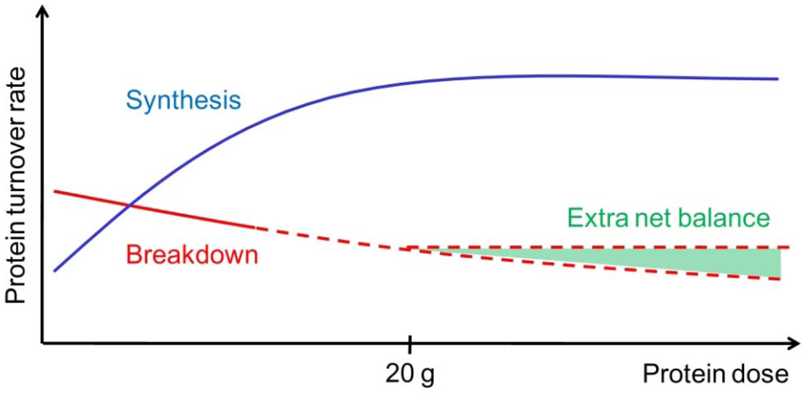 Illustration of muscle protein synthesis (MPS, blue curve) and muscle protein breakdown (MPB, red curve) rates in response to graded intake of protein. With increasing protein ingestion, MPS increases fast but reaches a plateau (at approximately 20 g high quality protein). In contrast to the MPS, MPB are hypothesized to decrease slightly but continuously with increasing protein or amino acid intakes. Therefore, the net muscle protein balance can possibly benefit from an even greater protein intake than known to stimulate MPS maximally (illustrated by the extra net balance area marked with green).