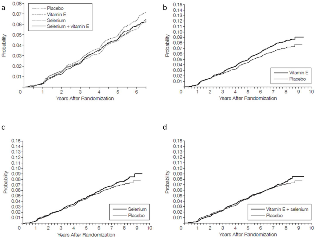 | Placebo (n = 8696) | Vitamin E (n = 8737) | Selenium (n = 8752) | Selenium + Vitamin E (n = 8703) | Placebo (n = 8696) | Vitamin E (n = 8737) | Selenium (n = 8752) | Selenium + Vitamin E (n = 8702) | |