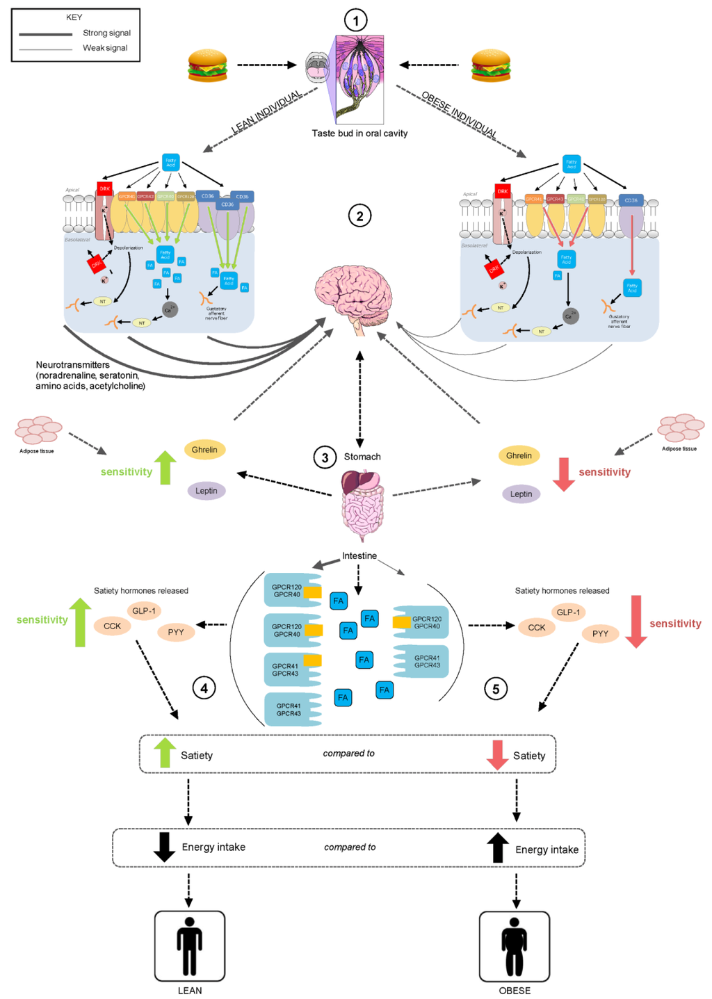 Schematic representation of fatty acid chemoreception in the oral cavity and gastrointestinal tract (alimentary canal) in lean (left) and obese (right) individuals. (1) Fat is present in foods in the form of triglycerides; free fatty acids are generated during the breakdown of fats and by lipase enzymes in the oral cavity. (2) Fatty acids access putative receptors (CD36, GPCR 40, 41, 43, 120 and delayed rectify potassium (DRK) channels) within taste cells; lean individuals have greater quantities of these receptors, compared to obese individuals. The receptors elicit the release of intracellular Ca2+ which in turn activates neurotransmitters and hormones associated with the cephalic response. (3) Following fat ingestion, gastric and pancreatic lipase plays a further role in the hydrolysis of fats enabling access to fatty acid receptors on enteroendocrine cells, stimulating satiety hormones and uptake of fatty acids. As a consequence, sensitivity to ghrelin, responsible for hunger stimulation is inhibited, while the satiety inducing hormone leptin is released as are the hormones CCK, PYY, GLP-1. (4) In a lean individual, expression of fatty acid receptors is greater therefore increasing fat sensing ability through the alimentary canal, thereby decreasing energy intake. (5) In comparison, obese individuals have decreased expression of fatty acid receptors, attenuating fat sensing ability and increasing energy intake.