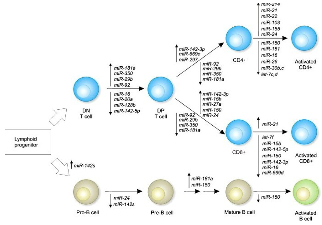 MicroRNAs involved in lymphoid differentiation. This figure summarizes the known changes in miRNA expression during differentiation/activation of T and B lymphocytes (Reprinted from [55] with permission from Elsevier).