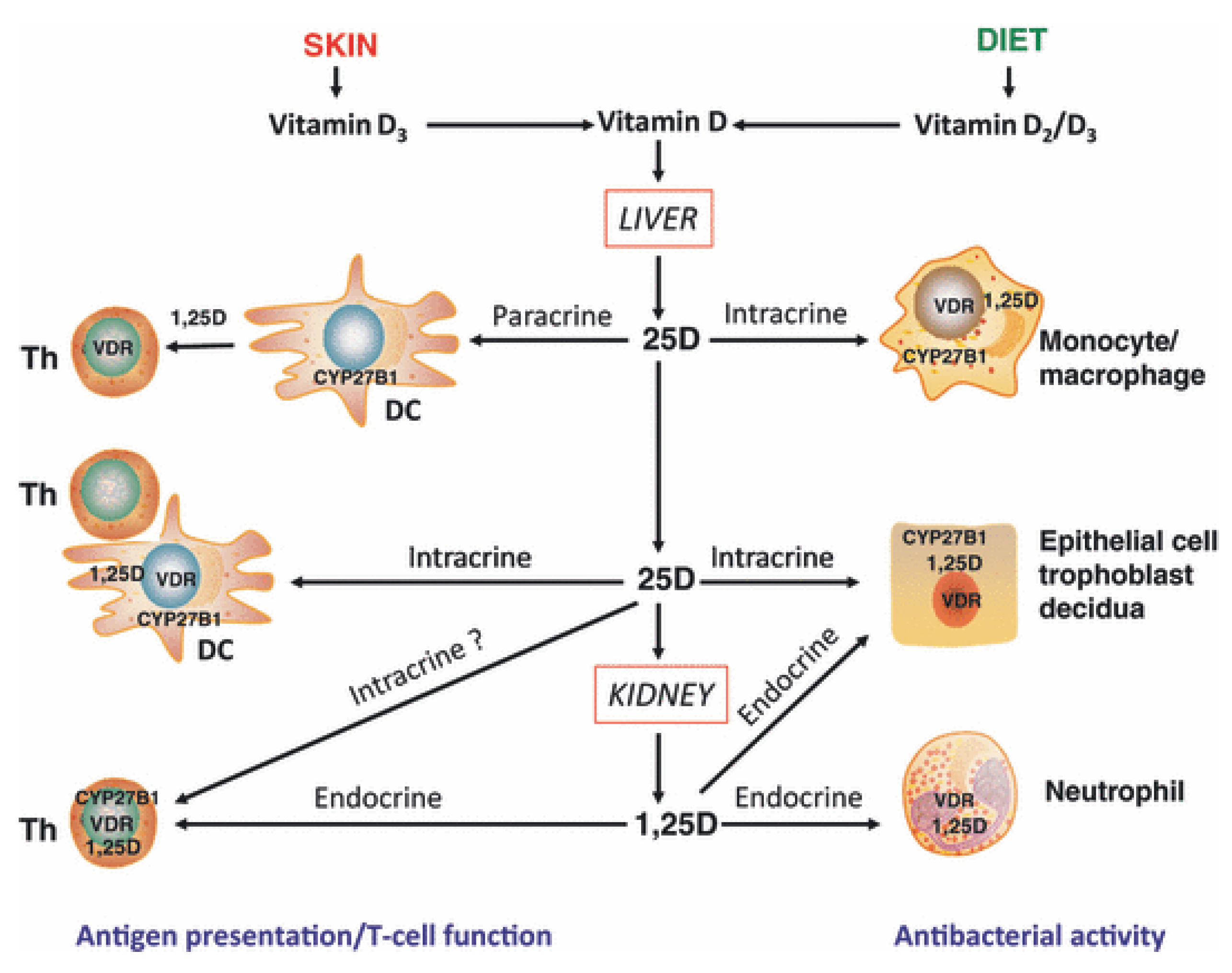 Mechanisms for innate and adaptive immune responses to vitamin D. Cholecalciferol (vitamin D3) or ergocalciferol (vitamin D2) are metabolized in the liver to form 25-hydroxyvitamin D (25D), the main circulating form of vitamin D. Target cells such as monocytes/macrophages and dendritic cells (DC) expressing the vitamin D-activating enzyme CYP27B1 and the vitamin D receptor (VDR) can then utilize 25D for intracrine responses via localized conversion to calcitriol (1,25D). In monocytes/macrophages this promotes antibacterial response to infection. In DCs, intracrine synthesis of 1,25D inhibits DC maturation, thereby modulating helper T-cell (Th) function. Th responses to 25D may also be mediated in a paracrine fashion, with DC-generated 1,25D. Intracrine immune effects of 25D also occur in CYP27B1/VDR-expressing epithelial cells. However, other cells such as neutrophils do not appear to express CYP27B1 and are therefore likely to be affected by circulating levels of 1,25D synthesized by the kidneys. VDR-expressing Th are also potential targets for systemic 1,25D, although intracrine mechanisms have also been proposed. In a similar fashion, epithelial cells, trophoblasts and decidual cells are all able to respond in an intracrine fashion to 25D, but may also respond to systemic 1,25D to promote antibacterial responses. With permission from Clinical Endocrinology [2].
