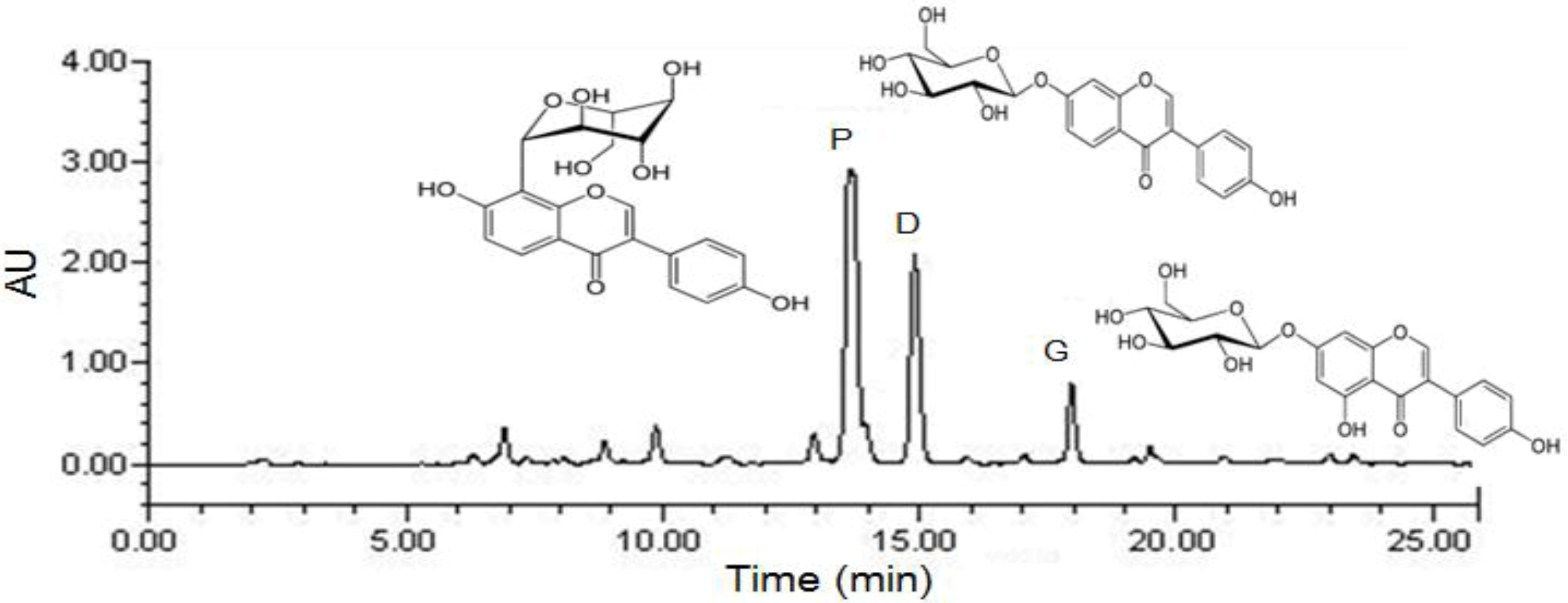 The HPLC chromatogram of total isoflavones is shown in Figure 1, and the puerarin, daidzin and genistin concentrations in the P. lobata extracts are listed in Table 1. After purification, puerarin (7.2%) was the major compound in the extract, which also contained daidzin (3.8%) and genistin (1.5%). The PTIF for oral administration was calculated based on its isoflavone contents.