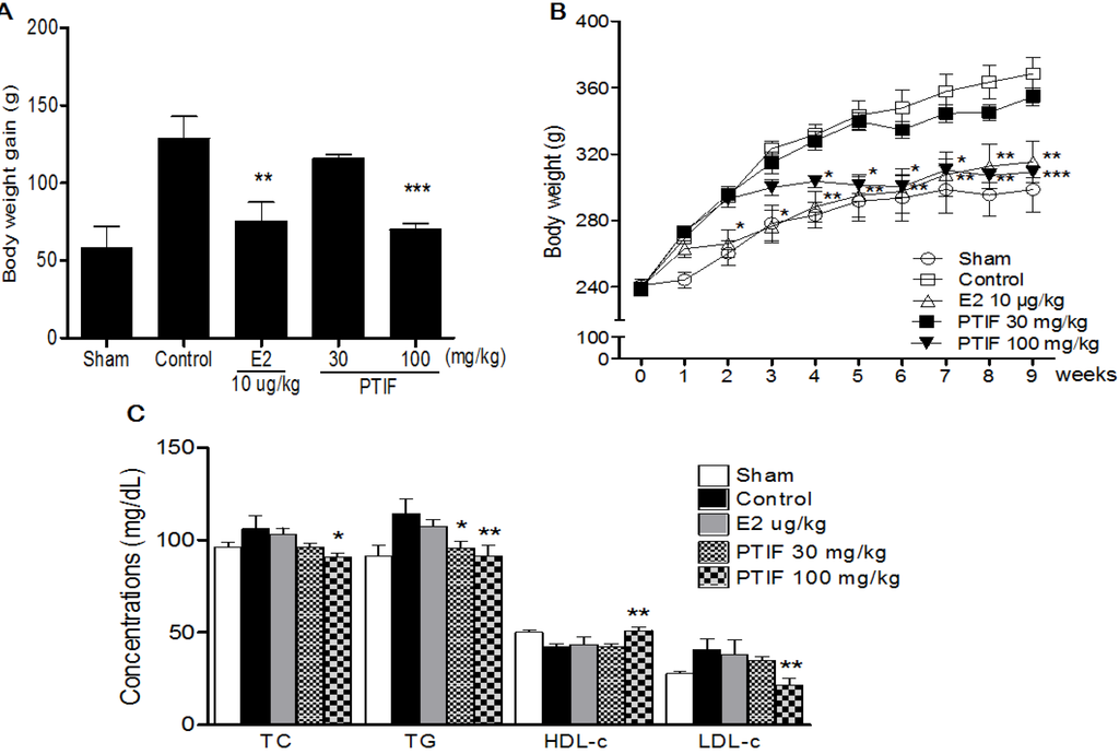 Effects of PTIF on body weight gain (A), weekly body weight (B) and serum lipid concentrations (C) in ovariectomized (OVX) rats. The body weight gain was calculated by the equation: final body weight − initial body weight. All data are the mean ± SEM values (n = 12 per group). Body weight was statically significant vs. control by repeated-measure ANOVA. Body weight gain and serum concentration were compared with control (one-way ANOVA). * p < 0.05, ** p < 0.01 and *** p < 0.001, significantly different from the OVX-control group.