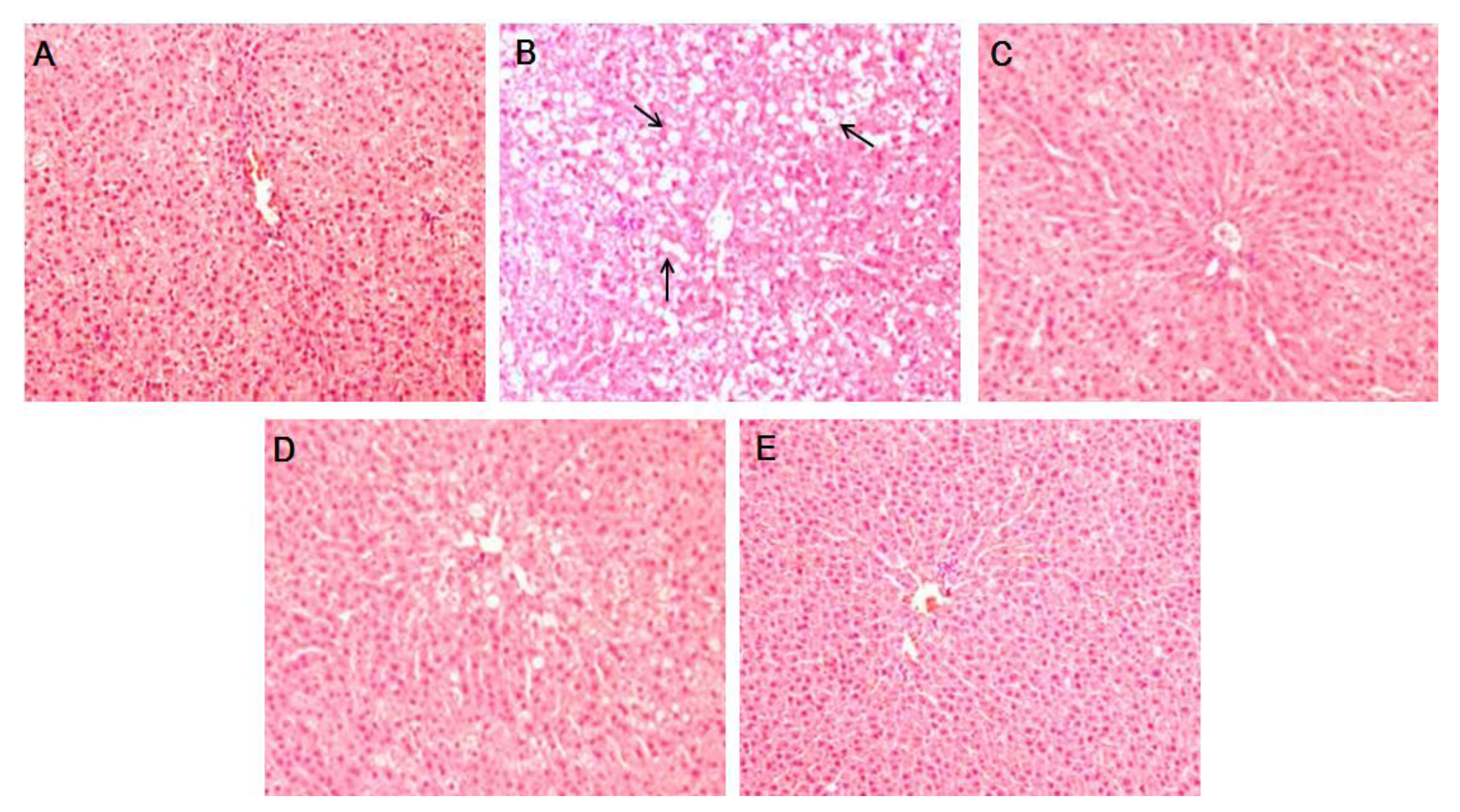 Histological images of liver tissues from OVX-induced hepatic steatosis displaying the hepatoprotective effects of PTIF. There were no histological abnormalities observed in sham rats (A). OVX-induced hepatic steatosis showing hepatocytes with severe cytoplasmic vacuoles and swelling (B). E2 10 μg/kg resulted in the prevention of hepatic fatty deposition in hepatocytes (C). The treatments with PTIF 30 and 100 mg/kg resulted in the prevention of hepatic fatty deposition in hepatocytes (D,E). The tissues were surgically excised and subjected to histological study by staining with hematoxylin and eosin (H & E). All magnifications: 200×. The arrows indicate fatty hepatocytes.