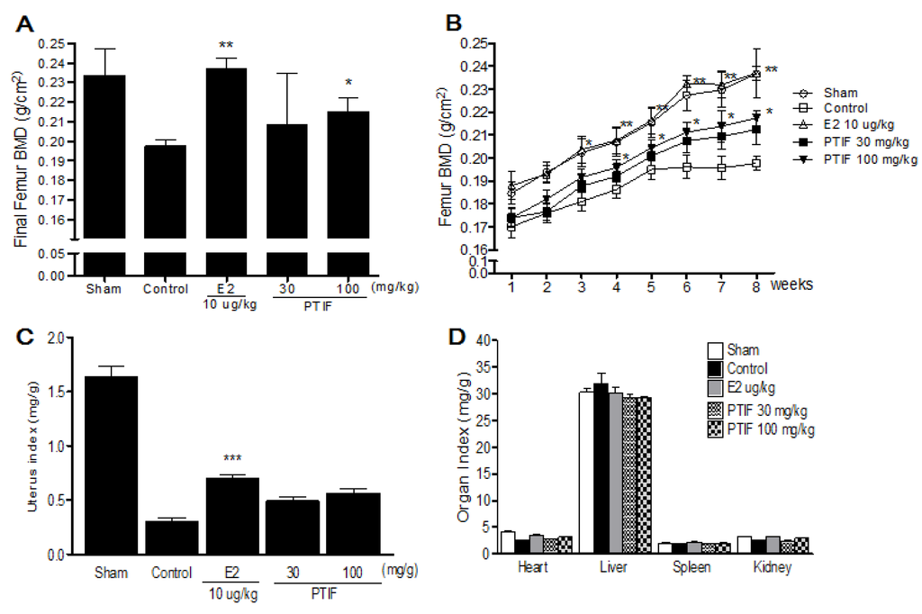 Three weeks after the OVX operation, OVX groups showed a significant decrease in the femur BMD compared to the sham group (Figure 4B). After eight weeks of treatments, the final femur BMD of the PTIF 100 mg/kg treated group was significantly higher than that of the OVX-control group (Figure 4A). OVX caused atrophy of uterine tissue, indicating the success of the surgical procedure and in the E2 10 μg/kg treated group, the uterus index (mg/g) increased significantly compared to the OVX-control group. However, the PTIF 30 and 100 mg/kg treated groups did not show an effect on the uterus index following OVX operation (Figure 4C). Also, the index of heart, liver, spleen and kidney was not significantly different in each group, either (Figure 4D).