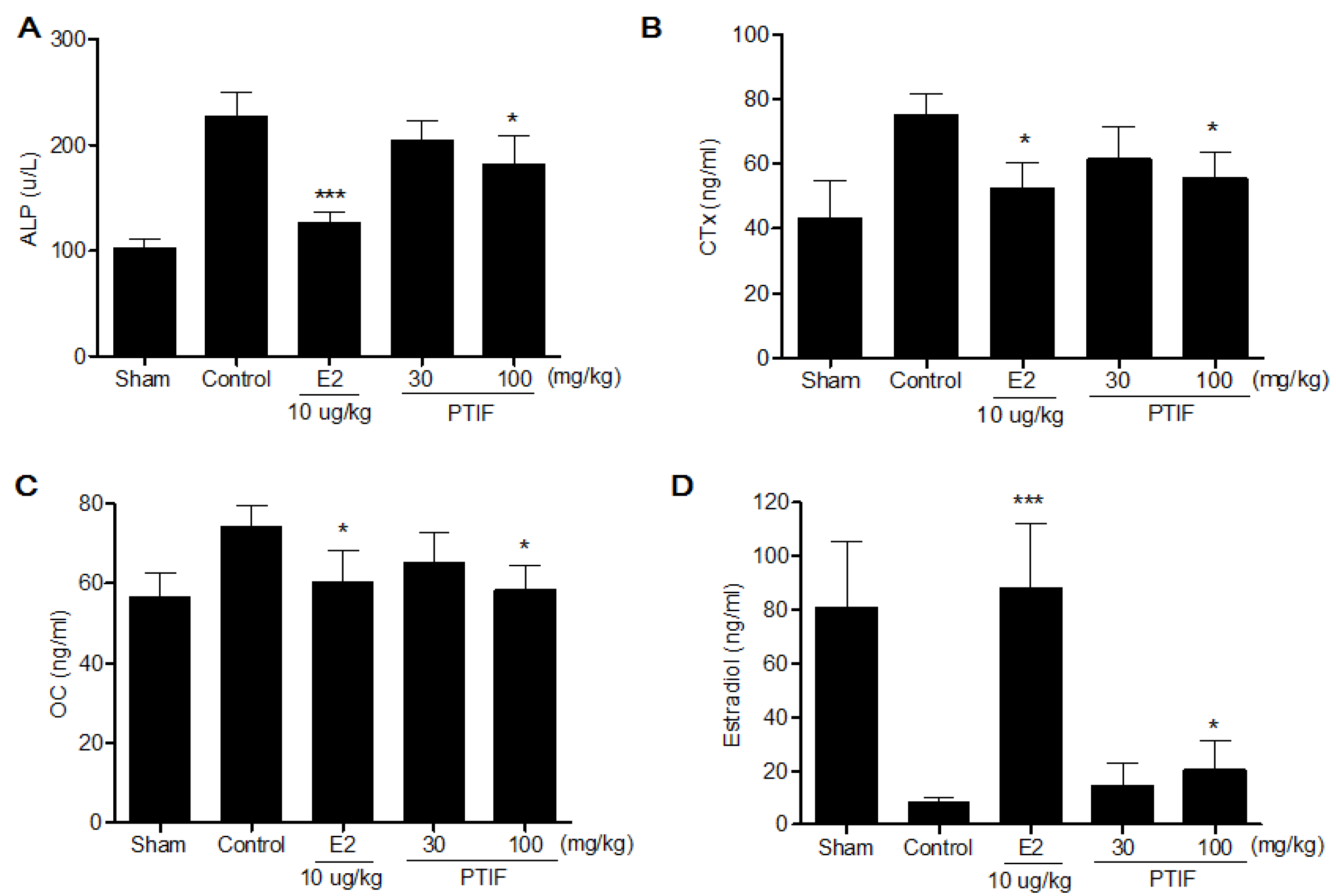 Effects of PTIF on serum alkaline phosphatase (ALP) (A), collagen type I (CTx) (B), osteocalcin (OC) (C) and estradiol (D) levels. Data are the mean ± SEM values (n = 12 per group). * p < 0.05 and *** p < 0.001, significantly difference from the OVX-control group.