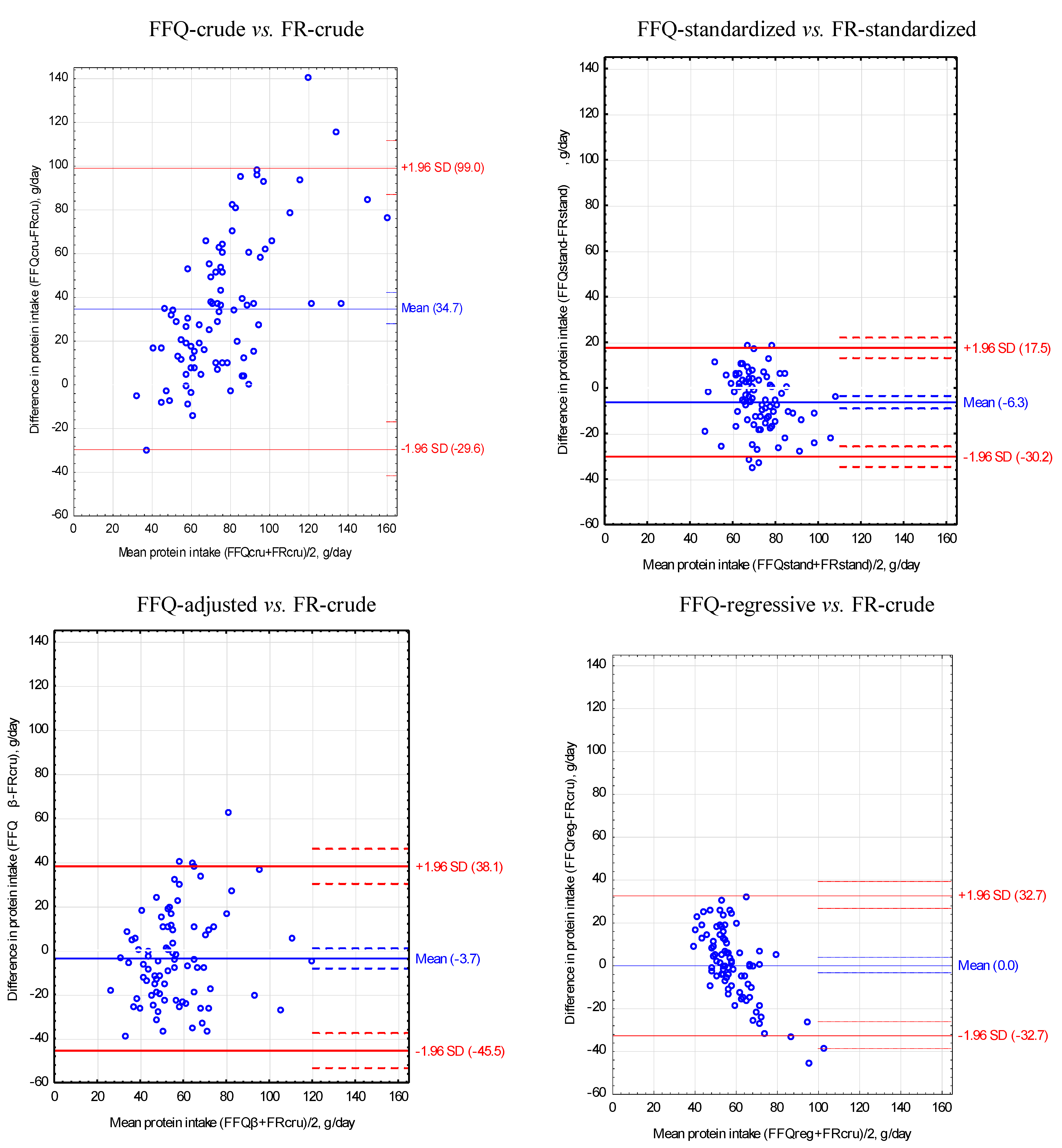 | Vegetable protein (g) | 0.21 | 13.75 | 7.07 | y = 0.21 × x + 13.75 ± 7.07 | 0.12 | <0.001 |