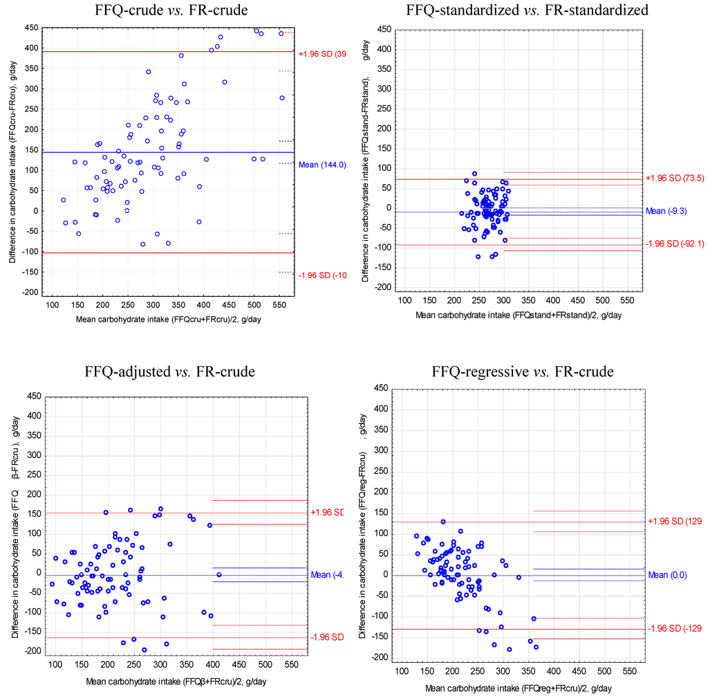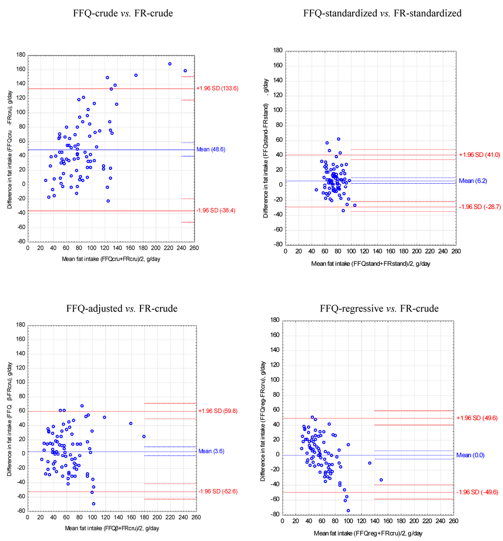 The food frequency questionnaire (FFQ) and the food record (FR) are among the most common methods used in dietary research. It is important to know that is it possible to use both methods simultaneously in dietary assessment and prepare a single, comprehensive interpretation. The aim of this study was to compare the energy and nutritional value of diets, determined by the FFQ and by the three-day food records of young women. The study involved 84 female students aged 21–26 years (mean of 22.2 ± 0.8 years). Completing the FFQ was preceded by obtaining unweighted food records covering three consecutive days. Energy and nutritional value of diets was assessed for both methods (FFQ-crude, FR-crude). Data obtained for FFQ-crude were adjusted with beta-coefficient equaling 0.5915 (FFQ-adjusted) and regression analysis (FFQ-regressive). The FFQ-adjusted was calculated as FR-crude/FFQ-crude ratio of mean daily energy intake. FFQ-regressive was calculated for energy and each nutrient separately using regression equation, including FFQ-crude and FR-crude as covariates. For FR-crude and FFQ-crude the energy value of diets was standardized to 2000 kcal (FR-standardized, FFQ-standardized). Methods of statistical comparison included a dependent samples t-test, a chi-square test, and the Bland-Altman method. The mean energy intake in FFQ-crude was significantly higher than FR-crude (2740.5 kcal vs. 1621.0 kcal, respectively). For FR-standardized and FFQ-standardized, significance differences were found in the mean intake of 18 out of 31 nutrients, for FR-crude and FFQ-adjusted in 13 out of 31 nutrients and FR-crude and FFQ-regressive in 11 out of 31 nutrients. The Bland-Altman method showed an overestimation of energy and nutrient intake by FFQ-crude in comparison to FR-crude, e.g., total protein was overestimated by 34.7 g/day (95% Confidence Interval, CI: −29.6, 99.0 g/day) and fat by 48.6 g/day (95% CI: −36.4, 133.6 g/day). After regressive transformation of FFQ, the absolute difference between FFQ-regressive and FR-crude equaled 0.0 g/day and 95% CI were much better (e.g., for total protein 95% CI: −32.7, 32.7 g/day, for fat 95% CI: −49.6, 49.6 g/day). In conclusion, differences in nutritional value of diets resulted from overestimating energy intake by the FFQ in comparison to the three-day unweighted food records. Adjustment of energy and nutrient intake applied for the FFQ using various methods, particularly regression equations, significantly improved the agreement between results obtained by both methods and dietary assessment. To obtain the most accurate results in future studies using this FFQ, energy and nutrient intake should be adjusted by the regression equations presented in this paper.