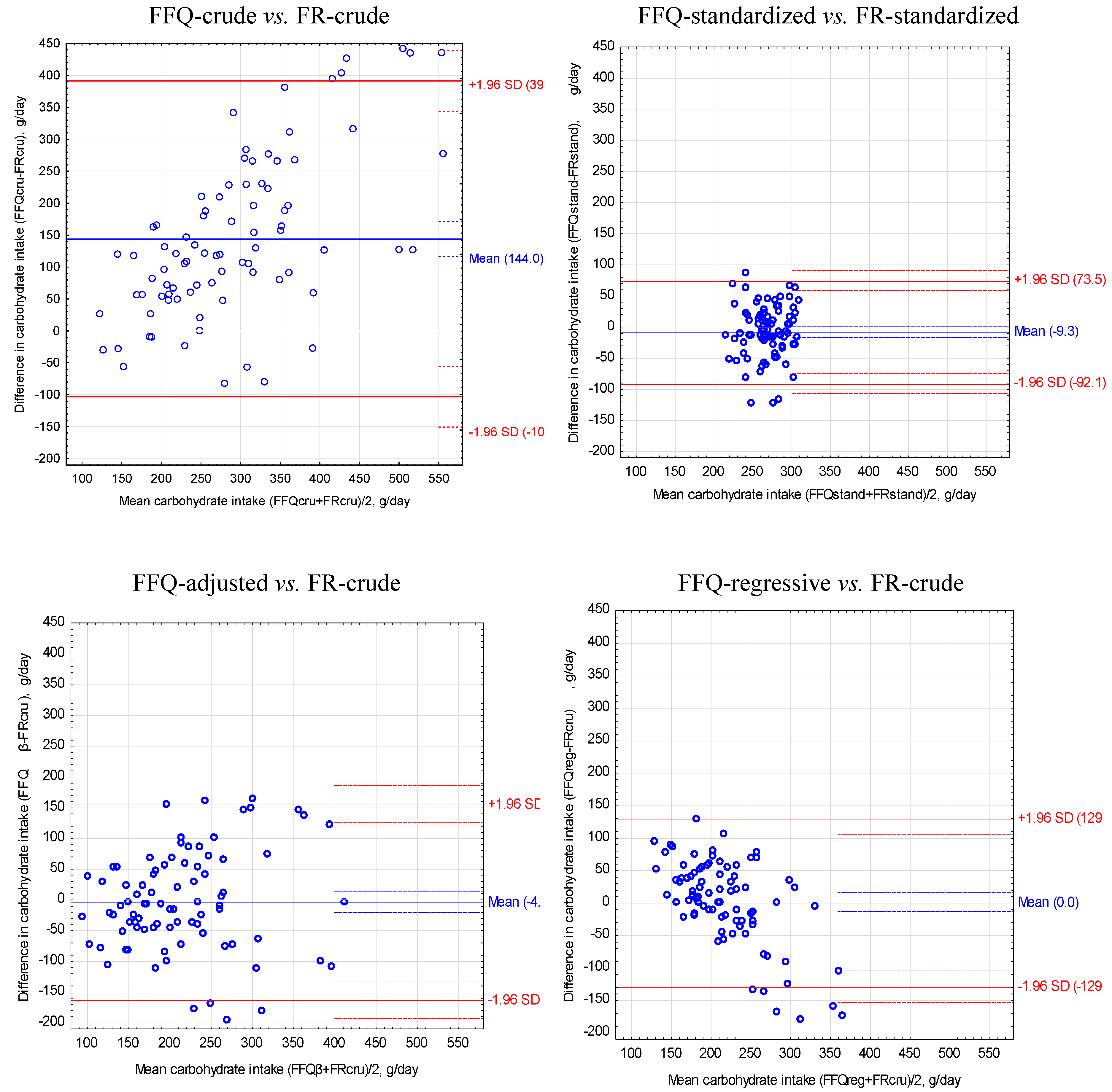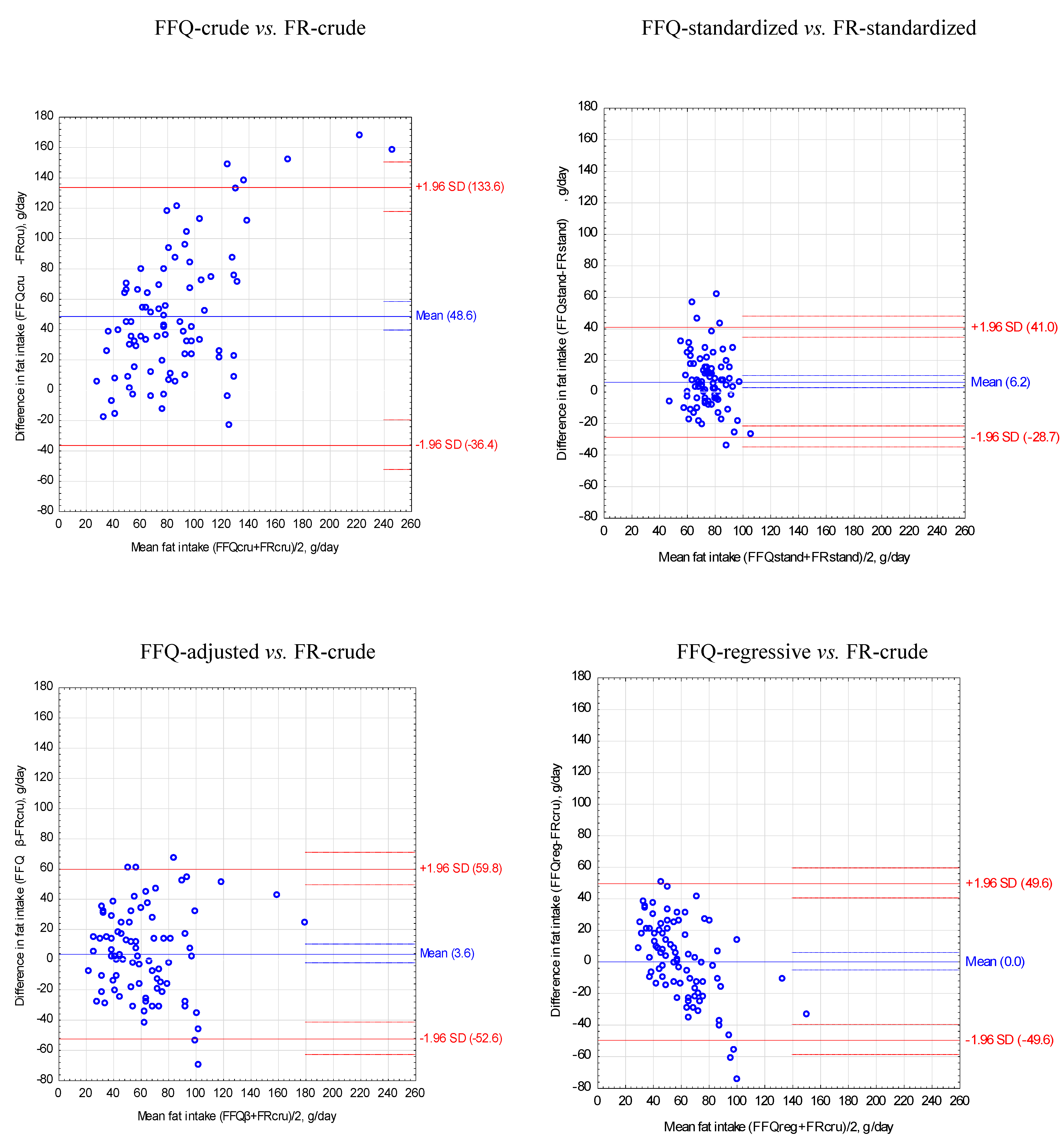 The Bland-Altman method was used to assess the agreement between the results obtained with both methods [30]. On the basis of energy and nutrient intake obtained by the FFQ and the food record, the following values were calculated: mean absolute difference in nutrient intake in both methods (ADmean, formula 1), mean intake of the nutrient for both methods (xboth methods, formula 2), limits of agreement (LOA, formula 3), and variation coefficient (VC, formula 4).