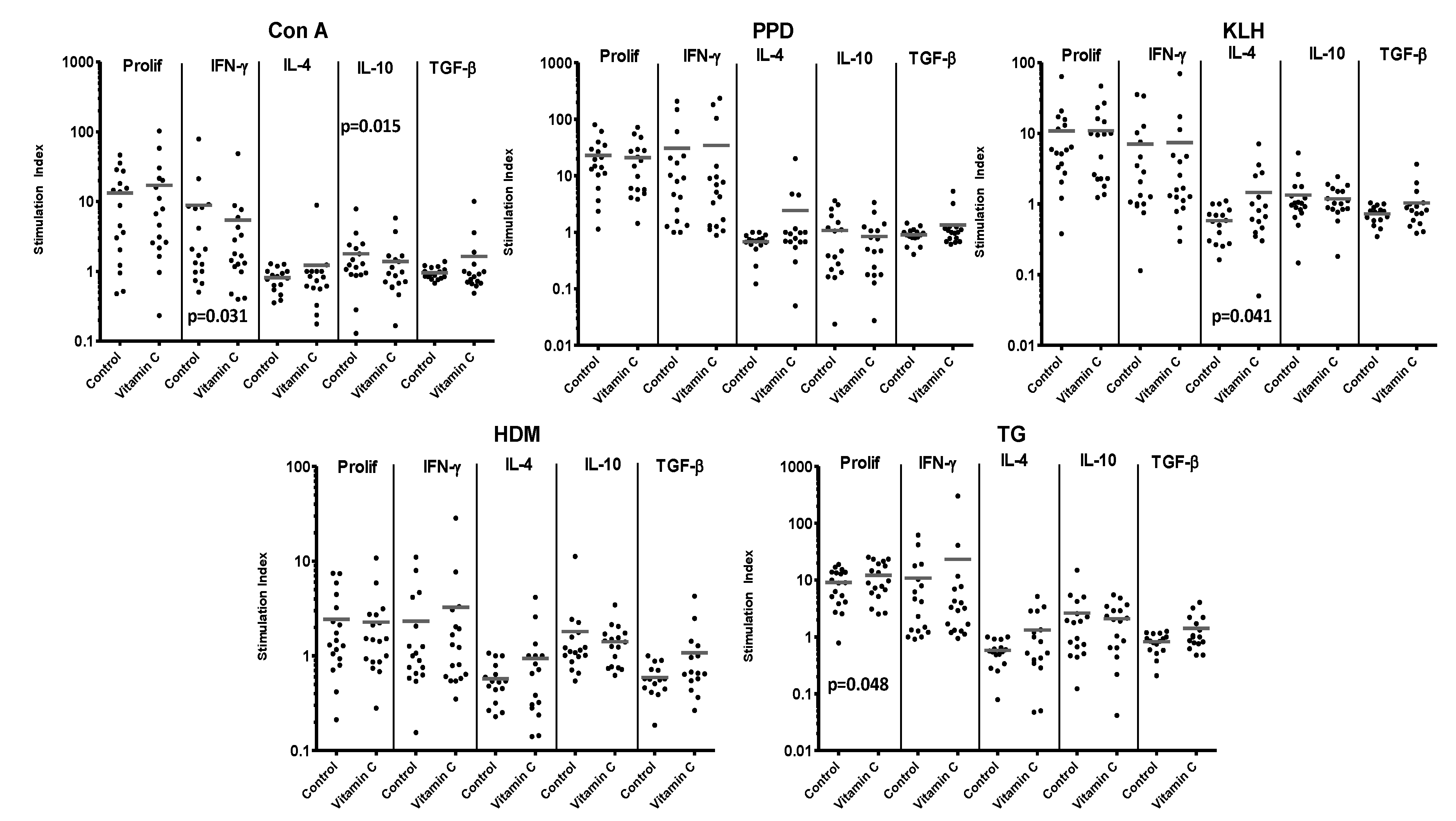 | Vitamin E | Prolif | IFN-γ | IL-4 | IL-10 | TGF-β | Vitamin C | PROLIF | IFN-γ | IL-4 | IL-10 | TGF-β |