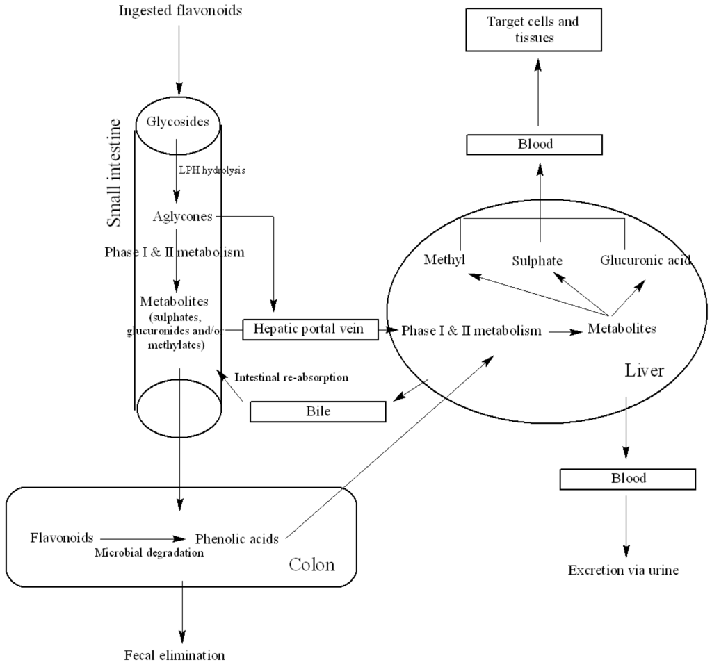 A simplified schematic of human flavonoid metabolism. Ingested flavonoids undergo extensive intestinal metabolism. Metabolites are then transported to the liver via hepatic portal vein and undergo further metabolism. The liver metabolites can be transported to targeted cells and tissues, excreted to bile and undergo enterohepatic re-circulation, or eliminated via urine and/or feces. The aglycones or flavonoid metabolites that reach the colon can undergo microbial degradation and reabsorption (LPH: lactase-phlorizin hydrolase; adapted from [] with modifications).
