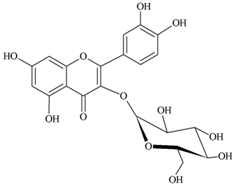 Metabolism, rate and amount of dietary quercetin absorption in humans appear to depend primarily on the type and position of sugar moiety []. According to Graefe et al. [], bioavailability of quercetin metabolites were five times higher when quercetin was administered as quercetin-4′-O-glucoside (Cmax: 2.1 ± 1.6 µg/mL; tmax: 0.7 ± 0.3 h) instead of quercetin-3-O-rutinoside (Cmax: 0.3 ± 0.3 µg/mL; tmax: 7.0 ± 2.9 h) and the site of absorption for these glycosides were different. Regardless of the type of quercetin glycoside administered, the potentially active quercetin metabolites (glucuronides) were identical in human plasma. Bioavailability of the ingested quercetin also depends on its dietary source. In a clinical study, consumption of onion powder (Cmax: 273.2 ± 93.7 ng/mL; tmax: 2.0 ± 1.7 h; t1/2: 14.8 ± 4.8 h) led to faster absorption, higher plasma concentrations and greater bioavailability compared to apple peel powder (Cmax: 63.8 ± 22.4 ng/mL; tmax: 2.9 ± 2.0 h; t1/2: 65.4 ± 80.0 h) []. Quercetin glycosides in onion powder were mainly quercetin-3,4′-O-glucoside and 4′-O-glucoside whereas in apple peels were quercetin-3-O-arabinoside, 3-O-galactoside, 3-O-glucoside and 3-O-rhamnoside [].