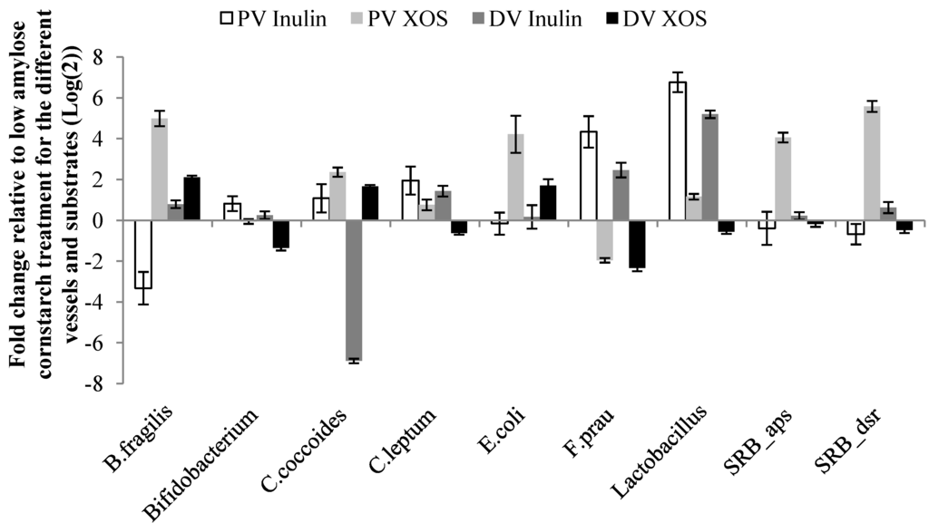 Microbial response to changes in carbohydrate source in a human colonic simulator. Changes are presented as fold change (mean ± SEM) relative to low amylose cornstarch treatment for the two vessels and inulin or XOS, respectively. PV: proximal vessel; DV: distal vessel. SRB: Sulfate-reducing bacteria, aps: Adenosine-5-phosphosulfate reductase gene, dsr: Dissimilatory sulfite reductase gene.