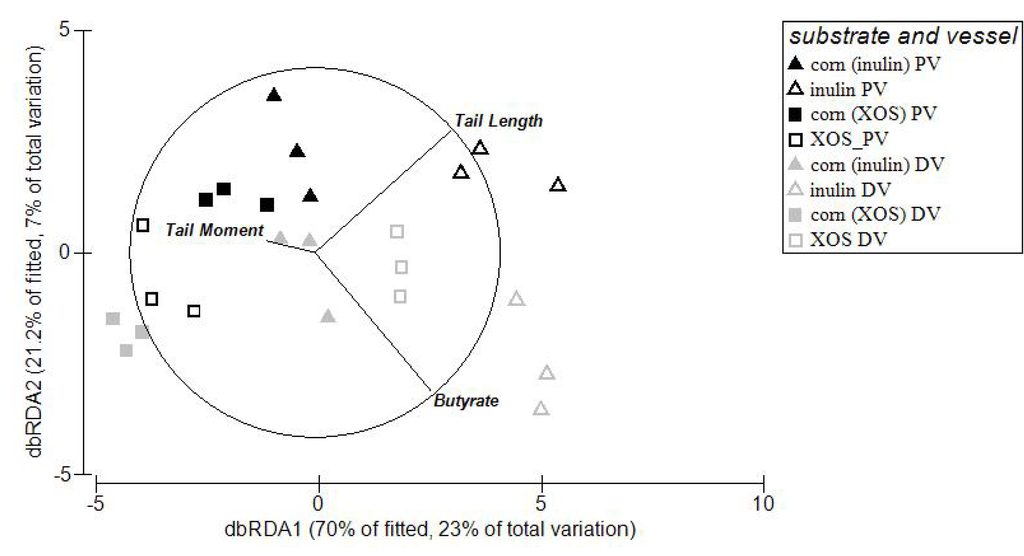 SCFA data and DNA damage data was tested for normal distribution using the Shapiro-Wilk test. Non-normal distributed data was transformed, propionate concentrations were transformed using natural logarithm, whereas tail length was transformed using reflect and square root. Normal and transformed data were analysed using a one-way analysis of variance (ANOVA) to assess significant difference between groups within fermenter and treatment. PASW version 18 [31] computer software was used for these statistical analyses. The microbial data was normalised to the total number of bacteria in the sample and presented as fold change relative to the low amylose cornstarch treatment for the appropriate vessel and substrate. Microbial fold changes were analysed for changes within vessels between inulin and XOS, and between vessels within substrate using the multivariate statistical package Primer 6 with Permanova+ (PRIMER-E Ltd., Plymouth, UK) using one- and two-factorial analysis based on a Euclidean distance matrix. Distance-based linear models (DISTLM) and distance based redundancy analysis (dbRDA) [32,33] was used to investigate the relationship between microbial data, DNA damage and biochemical measures To identify the key biochemical measures best explaining the relationship between the different data Best was used as selection procedure and adjusted R2 as the selection criteria. A P-value of less than 0.05 was considered statistical significant.