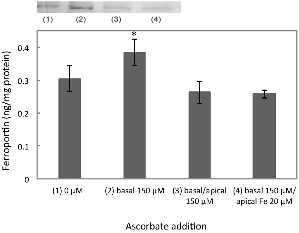 Sodium ascorbate (150 μM) was added to the apical and/or basal medium of Caco-2 cells cultured on permeable Transwell® inserts. Ferroportin protein expression was measured with ELISA. Data are means ± SD, n = 12. Significant differences from the baseline (0 μM) are labeled with an asterisk (*). A western blot of ferroportin at the corresponding treatments is shown above the graph.