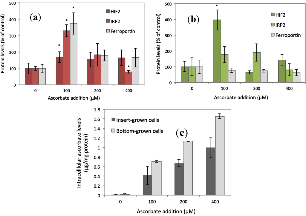 (a) Sodium ascorbate was added to the basal medium of Caco-2 cells cultured on permeable Transwell® inserts. HIF2, IRP2, and ferroportin protein expression was measured with a sandwich ELISA. Data are means ± SD, n = 6. Significant differences from the baseline (0 μM) are labeled with an asterisk (*). (b) The same experiments as in (a) were repeated using Caco-2 cells cultured directly on the bottom of the wells. Instead of basal addition of sodium ascorbate, ascorbate was added to the apical medium. (c) Intracellular ascorbate levels of cells treated with sodium ascorbate (0, 100, 200, and 400 μM). Data are means ± SD, n = 3.