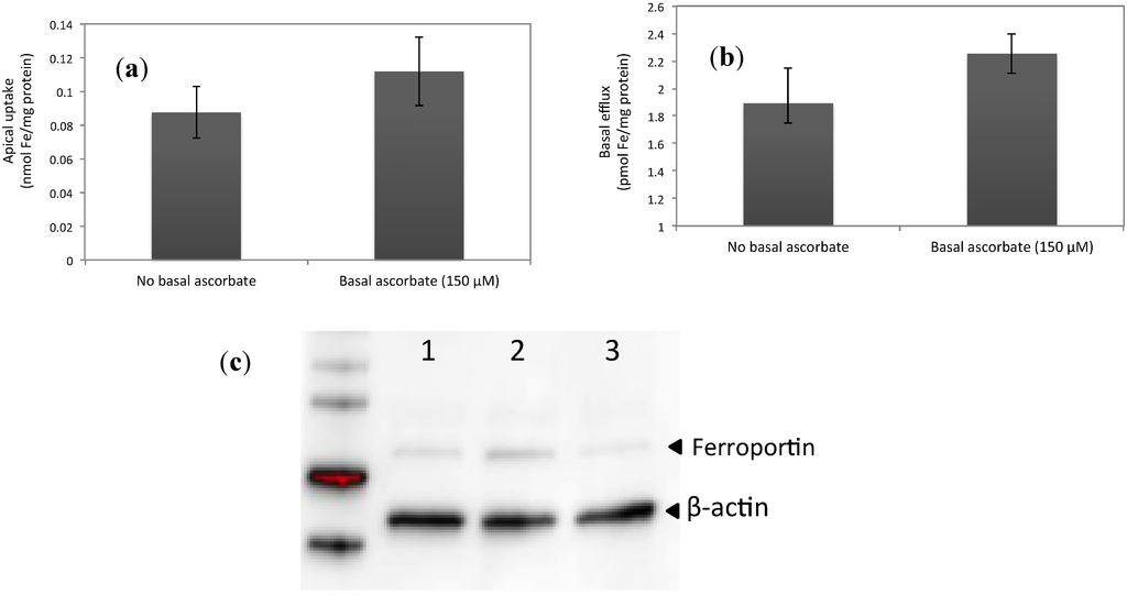 Iron (55Fe) transport across the apical and basal borders. (a) Apical transport (uptake) of 55Fe in response to intracellular/basal ascorbate (150 μM) was increased compared to no ascorbate. The cells were incubated with ascorbate in the basal chamber for 24 h. Values are means of 10 samples ±SD. The difference between treatments was significant (p = 0.04). (b) Basolateral transport of iron (as 55Fe) in response to intracellular/basal ascorbate (150 μM) was increased compared to no ascorbate. The cells were incubated with ascorbate in the basal chamber for 24 h. Values are means of 10 samples ±SD. The difference between treatments was significant (p = 0.03). (c) Western Blot of cells treated with ascorbate (150 μM). Lane 1: Control cells (no treatment). Lane 2: Basal ascorbate at 150 μM; these were the ferroportin levels before iron addition in (a). Lane 3: Ferroportin levels 22 h after the iron addition (20 μM for 2 h) in (a).