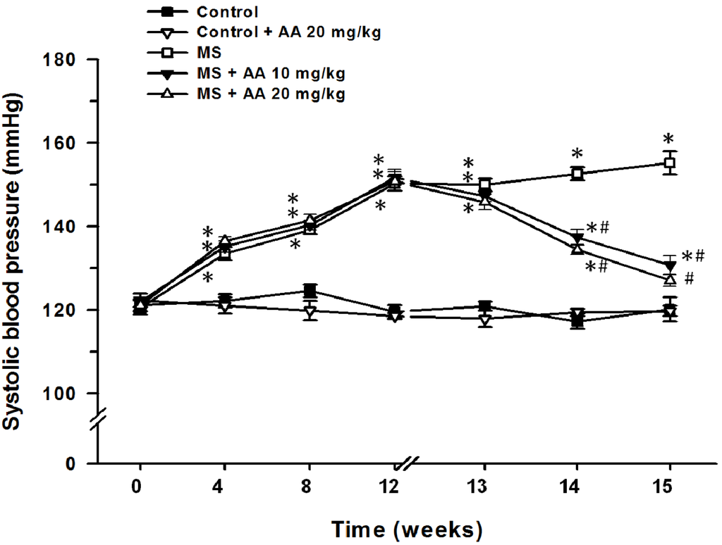 Effect of asiatic acid on systolic blood pressure in all experimental groups. Results are expressed as mean ± SEM. AA represents asiatic acid. * p < 0.05 vs. control group, # p < 0.05 vs. MS group (n = 8/group).