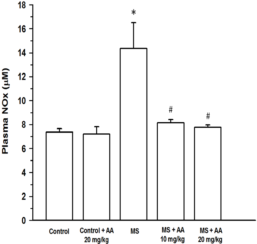 Effect of asiatic acid on plasma nitric oxide metabolites (NOx) in all experimental groups. Results are expressed as mean ± SEM. AA represents asiatic acid. * p < 0.05 vs. control group, # p < 0.05 vs. MS group (n = 8/group).