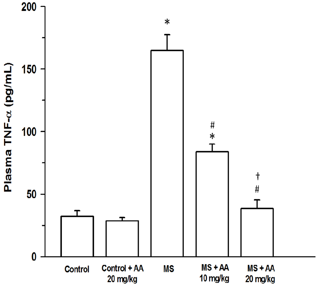 Effect of asiatic acid on plasma TNF-α in all experimental groups. Results are expressed as mean ± SEM. AA represents asiatic acid. * p < 0.05 vs. control group, # p < 0.05 vs. MS group, † p < 0.05 vs. MS + AA 10 mg/kg group (n = 8/group).