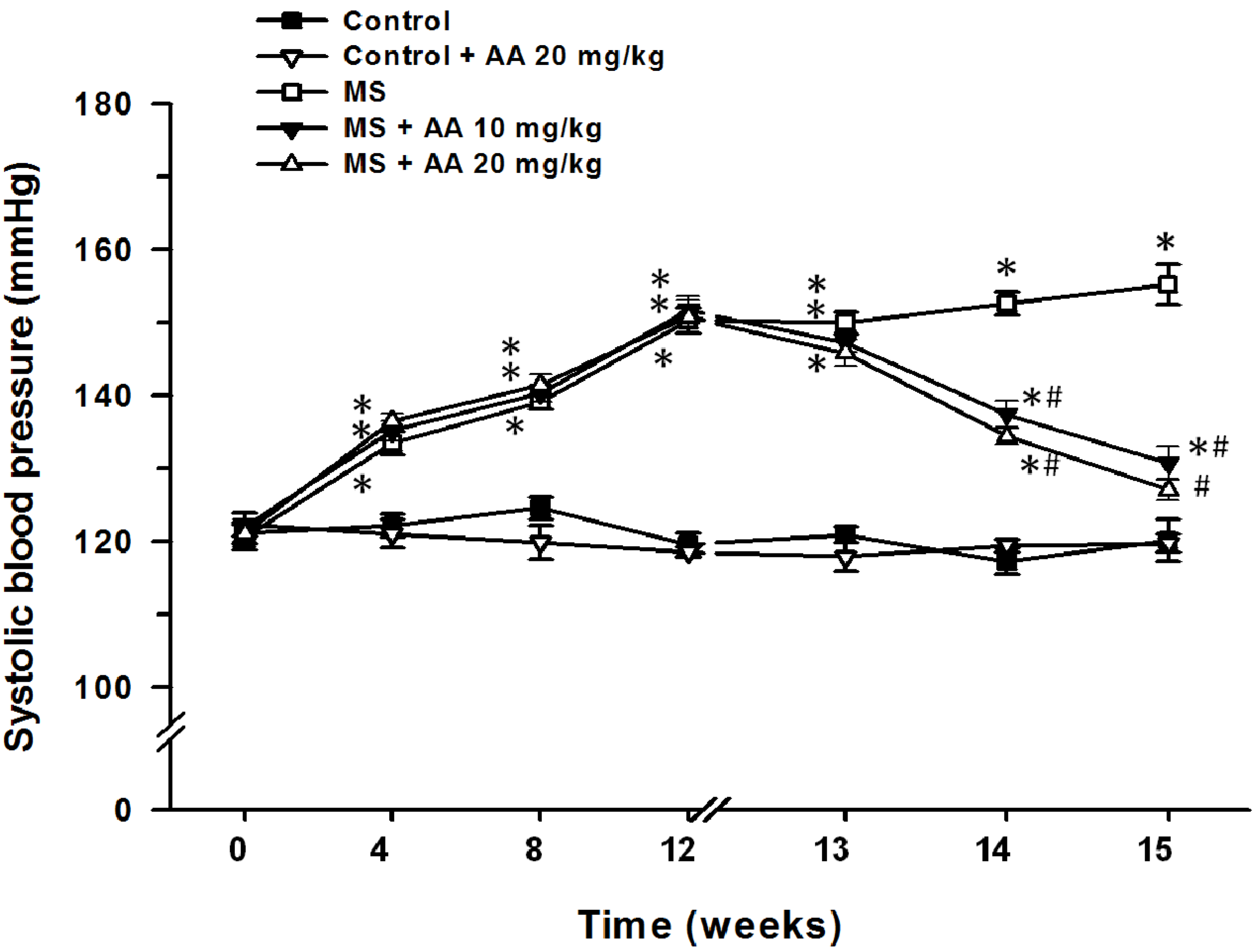 3.2. Effects of Asiatic Acid on SP (Indirect Measurement of Blood Pressure)