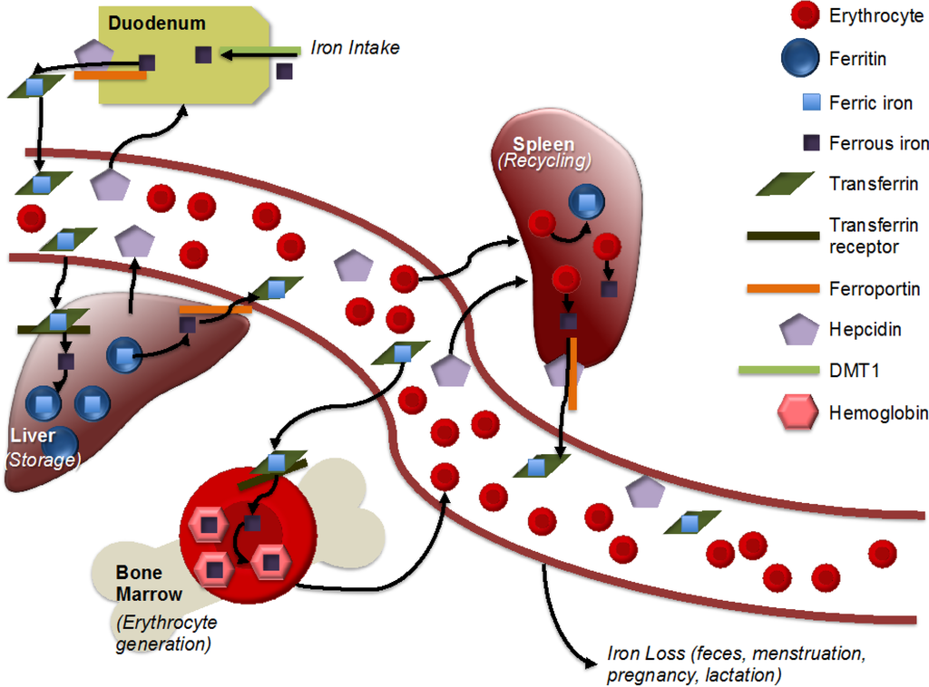 Simplified representation of iron metabolism. Adapted from [12]. Iron is absorbed in the intestine, with non-heme iron being imported by divalent metal transporter 1 (DMT1). Ferrous iron is reduced to ferric iron and then exported by ferroportin. Within an aqueous solution, iron is stored within transferrin. Transferrin-bound iron is imported with the help of the transferrin receptor into the liver, heart and other storage areas, where it is stored within ferritin. Hepcidin, produced by the liver, helps to regulate iron metabolism by binding to ferroportin and, thus, inhibiting iron export. Within the bone marrow, iron is incorporated into hemoglobin for incorporation into erythrocytes. Macrophages recycle iron from erythrocytes, largely in the spleen. There is no mechanism for iron excretion by the kidneys or liver, though small amounts are lost via feces. Menstruation, pregnancy and lactation result in iron loss in women.