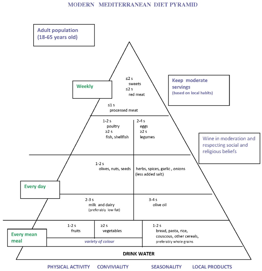 In 1992, the United States Department of Agriculture reported nutritional recommendations for the American population in the form of pyramid [1], helping people to make good dietary choices with the aim of reducing the risk of chronic diseases. The growing scientific evidence that the Mediterranean diet protects against coronary heart disease, some kinds of cancers and other chronic diseases and that it guarantees longevity in adults led some scientists to represent this dietary pattern as a pyramid. The success of this geometric figure in the nutritional field is possibly due to its ability to give information about the frequency and the proportion of food intake and at the same time representing a healthy diet. Over the years, some Mediterranean diet pyramids were elaborated by the USA [2,3] and by Mediterranean countries, such as Greece [4], Spain [5] and Italy [6], to give their populations dietary advice based on both cultural heritage and scientific evidence in order to prevent chronic diseases and promote longevity. The importance of the Mediterranean diet for a healthy lifestyle has been mainly recognized in the scientific world, whereas we believe this topic should be addressed by politicians.