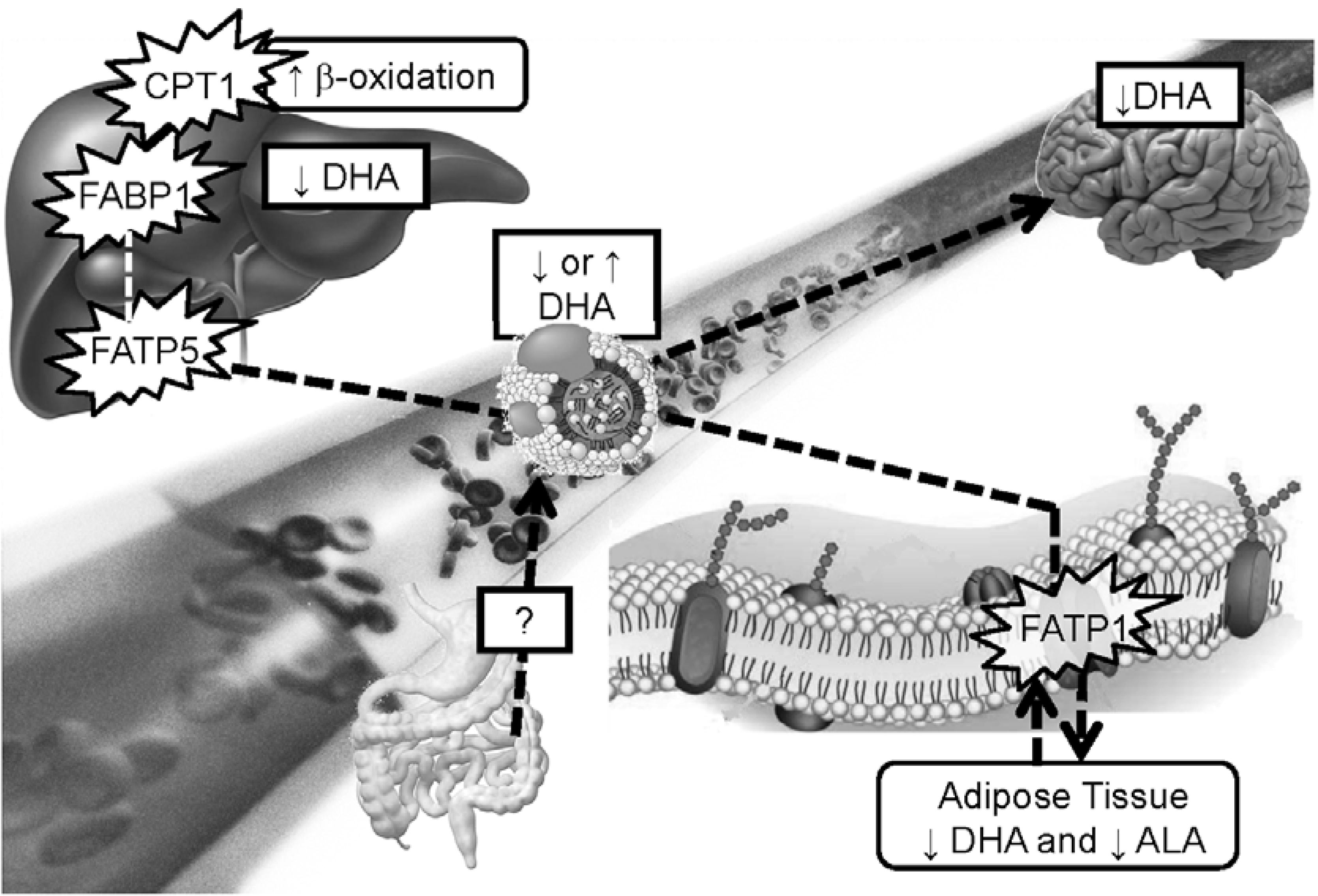 Working hypothesis for explaining how disrupt docosahexaenoic acid (DHA) kinetics in apolipoprotein E epsilon 4 (APOE4) carriers could be involved in the risk of cognitive decline and coronary heart disease. Blood DHA level reflects the balance between the uptake and release of fatty acids from organs, such as the liver and the adipose tissue. In humans and animals carrying an APOE4 allele, blood DHA was sometimes higher and some other times lower compared to the non-carriers. In mice knock-in for human APOE4 allele, adipose tissue and liver fatty acid transport protein (FATP) were unregulated compared to APOE3 mice. Hence, we would anticipate higher levels of DHA in adipose tissue and liver but it was the opposite, displaying lower levels of DHA in both tissues. In the liver, fatty acid binding protein (FABP) together with carnitine palmitoyl transferase 1 (CPT1) were unregulated in APOE4 mice compared to APOE3 mice. Hence, this shows higher capacity for β-oxidation of fatty acids in APOE4 carriers compared to the non-carriers. Brain DHA uptake was also lower in 4-month- and 13-month-old APOE4 mice compared to APOE2 mice and lower levels of DHA in the brain membranes were reported in 13-month-old APOE4 mice only [112]. In humans, it seems that postprandial DHA was lower in APOE4 carriers compared to the non-carriers. Hence, the gut-to-brain connection may play an important role in the delivery of LC omega-3 in APOE4 carriers for better brain and heart health.