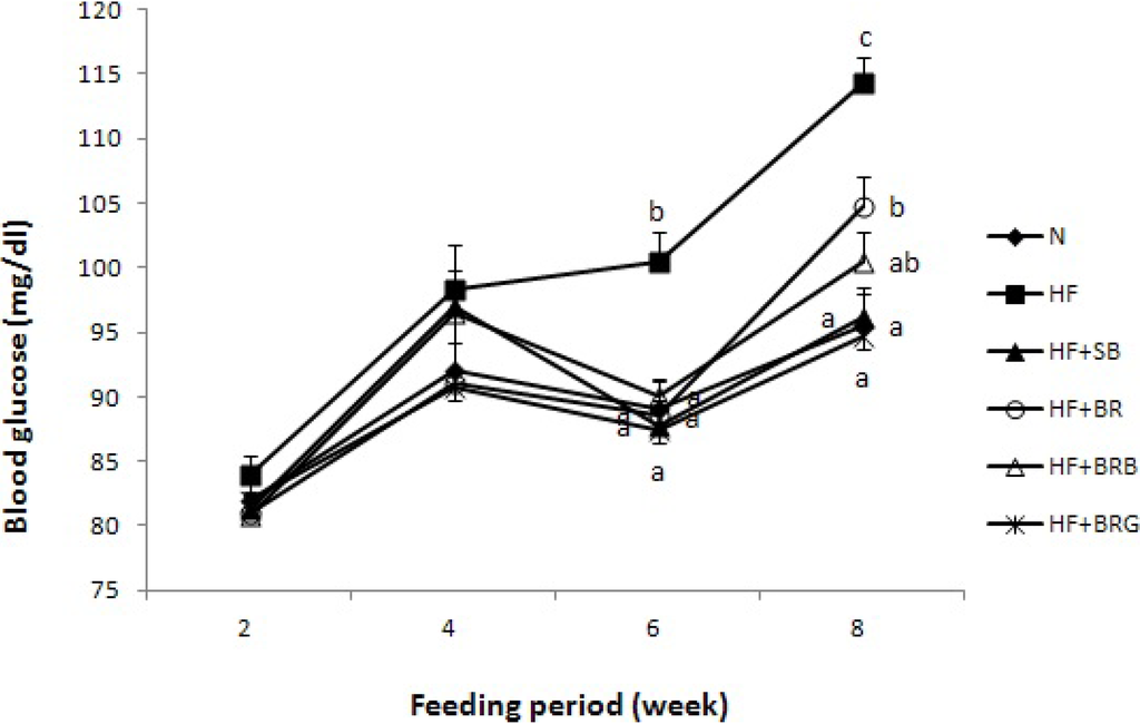 The concentration of blood glucose was similar among the animal groups during the second and third weeks of the feeding period (Figure 1). However, on the sixth week, the HF group showed significantly higher glucose level than the other groups. At the end of the experimental period, the HF group exhibited the highest glucose level, followed by the HF + BR group. The addition of SB and BRG fermented pastes in the high fat diet decreased the glucose concentration to normal level.