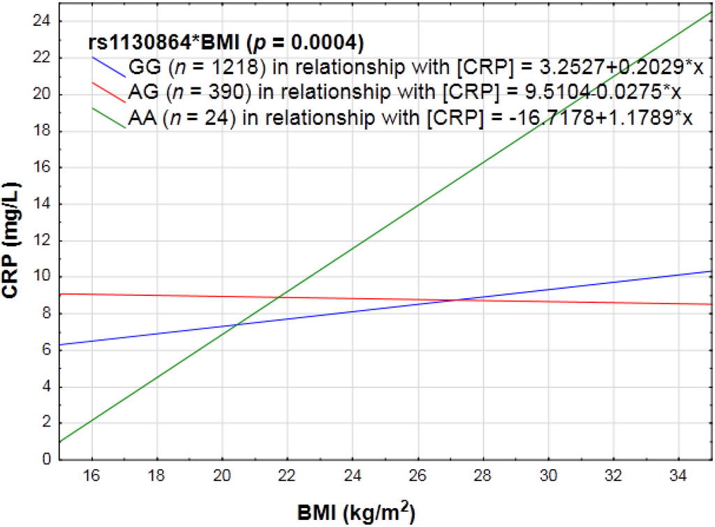 Interactions between several CRP genotypes and indices of body fatness were observed. Our findings extend the existing knowledge of the link between adipose tissue and inflammation [,,]. One of the ways in which the link between obesity and inflammation may be mediated, therefore, is through genotype body fat interaction effects, probably modulating the phenotype by changes in gene expression. It has been reported in previous studies that irrespective of the genetic background, diets to promote weight loss significantly diminish CRP concentrations [,,]. A decrease in adipose tissue reduces interleukin 6 (IL-6) concentrations, which in turn decreases CRP synthesis []. The interactive effect of the indicators of body fatness on the CRP genotypes investigated is, therefore, not surprising. However, we postulate that weight loss might be especially beneficial and effective to reduce low-grade inflammation in those harboring the minor alleles at rs1130864, rs3093058 and rs3093062.