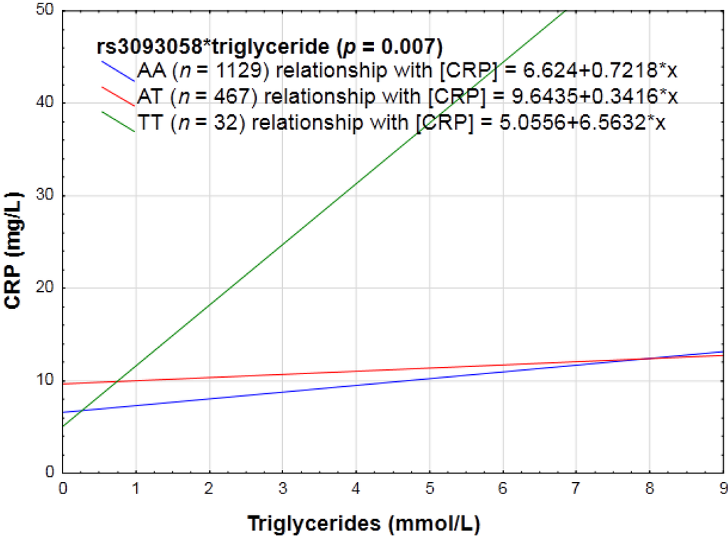 TC, LDL-C or HDL-C concentrations did not interact with any of the SNPs to influence CRP concentrations. Triglyceride concentrations interacted with rs3093058 (p = 0.007), rs3093062 (p = 0.007), and rs1130864 (p = 0.03), thus influencing the CRP phenotype. The interactions with rs3093058 and rs3093062 were the same, i.e., when homozygous for the polymorphic allele, CRP increased significantly more than when harboring the major allele (see Figure 2). When harboring the minor allele at rs1130864, increasing triglyceride concentrations did not promote inflammation, but when homozygous for the major allele increasing triglyceride concentrations were pro-inflammatory.