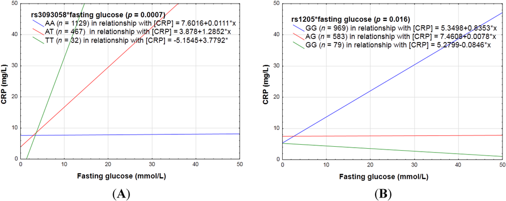 Examples portraying the linear relationship between fasting glucose in relation to CRP concentrations categorized for CRP SNPs with (A) a pro- (B) or anti-inflammatory effect with the addition of the polymorphic allele.
