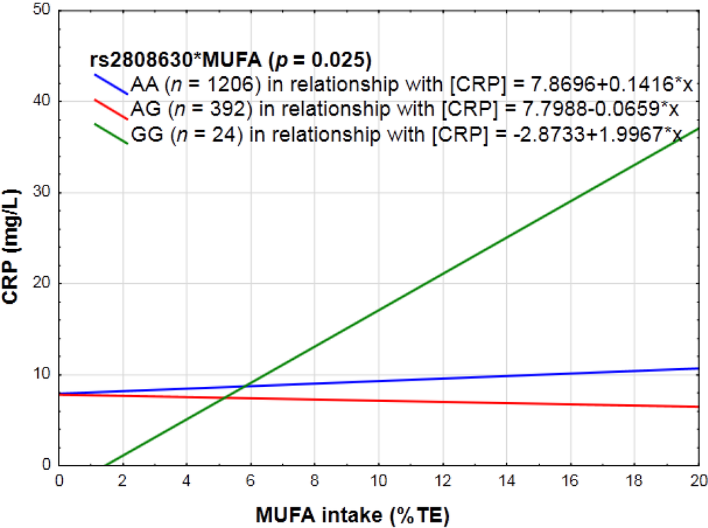 The linear relationship between monounsaturated fatty acids (MUFA) intake in relation to CRP concentrations categorized for rs2808630.