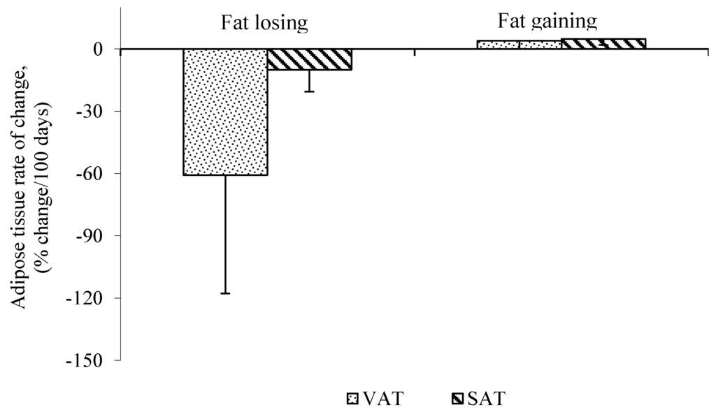 Mean rate of visceral adipose tissue (VAT) and subcutaneous adipose tissue (SAT) change in fat losing cancer patients assessed by consecutive computed tomography (CT) scans. Data are represented as Mean ± SD, n = 5 (Fat Losing) and n = 2 (Fat Stable), p < 0.05 VAT, visceral adipose tissue; SAT, subcutaneous adipose tissue.