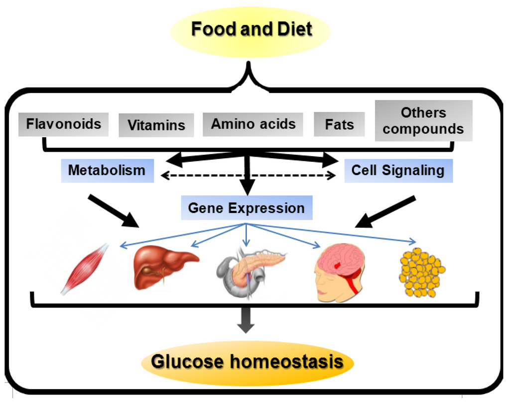 Nutrient-gene expression mechanisms. Nutrients present in food and diet can affect gene expression in a number of ways. They may directly act as ligands for transcription factors and change gene expression. Nutrients may be metabolized by different pathways, thereby modifying the concentration of substrates or intermediates that affect gene expression. Alternatively, the substrates or intermediates may act on or alter cell signaling pathways involved in gene expression. Moreover, nutrients may directly alter signal transduction pathways responsible for modifications in gene expression. Finally, the modifications in the signaling pathways, caused by nutrients, may modulate the metabolism of nutrients affecting gene expression. The modifications in gene expression may affect muscle, liver, pancreatic β cells, hypothalamus and adipose tissue, thereby regulating glucose homeostasis. The effects of these nutrient-gene interactions can be deleterious increasing DM risk and illness progression and complications or protective doing the opposite effects.