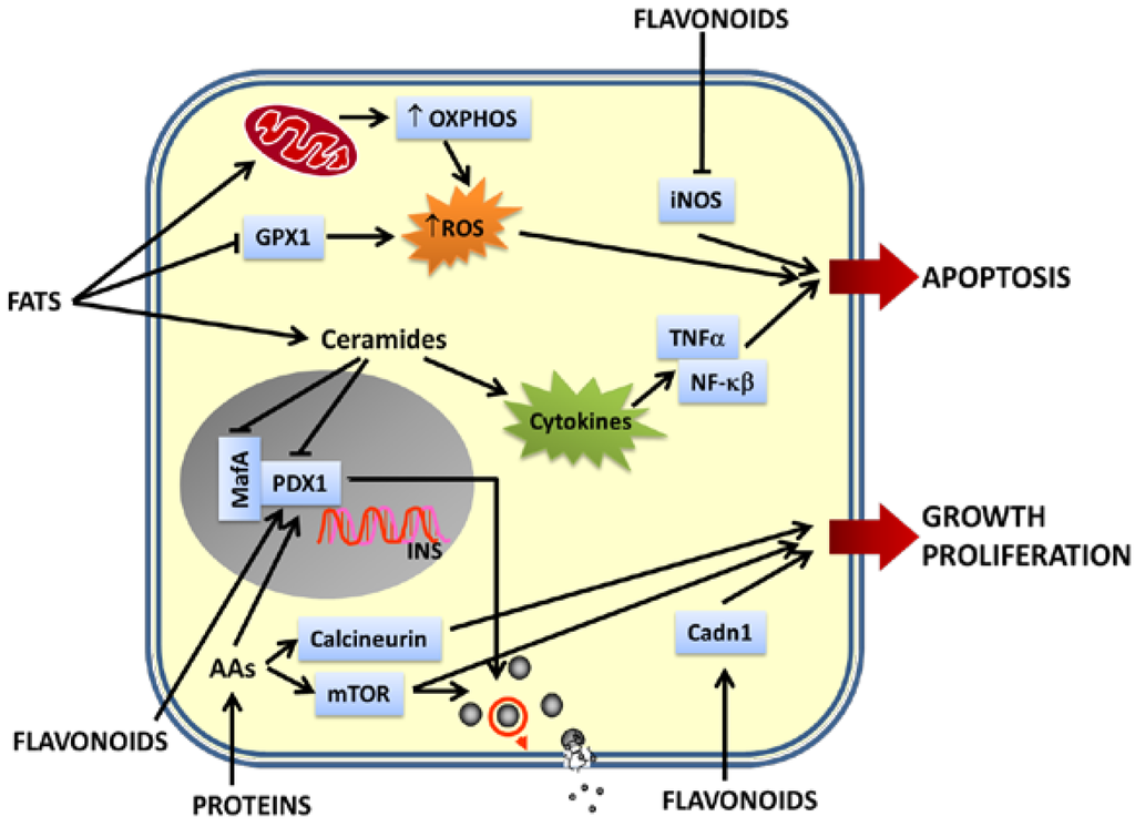 Interestingly, flavan-3-ols are present in many fruits, teas, cocoa and chocolate, especially epigallocatechin gallate (EGCG), and have been shown to improve insulin secretory function and the viability of β cells under conditions of glucotoxicity. These effects were mediated, at least in part, through increased expression of insulin receptor (Ir) substrate-2 (Irs2), protein kinase B (Akt), the forkhead box protein O1 (Foxo1) and pancreatic duodenal homeobox1 (Pdx1) [87]. EGCG has also been shown to protect insulin-producing β cells from pro-inflammatory cytokine-induced cytotoxicity via the modulation of B Cell CLL/Lymphoma 2 (Bcl-2) expression [88]. In addition, EGCG supplementation at pharmacological doses (1% in diet) improved insulin secretion from pancreatic β cells and preserved islet morphology in obese db/db mice by reducing the expression levels of carnitine palmitoyltransferase 1 (L-Cpt-1) and the endoplasmic reticulum stress marker DNA-damage-inducible transcript 3 (Ddit3), as well as its downstream targets protein phosphatase 1, regulatory subunit 15A (Ppp1r15a) and cyclin-dependent kinase inhibitor 1A (Cdkn1a) [89]. Thus, collectively, EGCG functions in many different roles that are associated with beneficial effects on DM. These changes include improvements in insulin secretion, glucose uptake, insulin resistance, glucose tolerance, oxidative stress, inflammation and mitochondrial function. In this regard, EGCG functions through modifications in the expression of genes involved in multiple signaling pathways to exert beneficial effects in DM (Table 3).