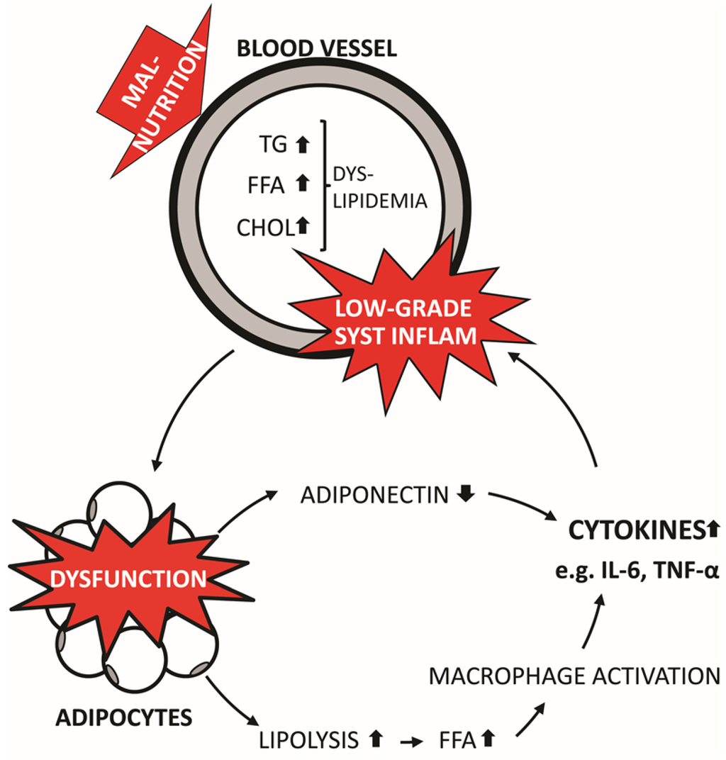 Dietary induced dyslipidemia leads to increased fat deposition and promotes hypertrophy and hyperplasia of adipocytes as well as cellular reprogramming leading to altered secretory functions of adipocytes. The tissue expansion and associated adipocyte dysfunction increases the release of inflammatory cytokines (such as IL6 and TNFα) and activates macrophages. Furthermore, release of the anti-inflammatory adipokines, e.g. adiponectin, is decreased. This induces a state of low-grade systemic inflammation, which in turn compromises insulin sensitivity and increases lipolysis in adipose tissues, increasing the release of free fatty acids (FFA) and exacerbating the dietary induced dyslipidemia. Moreover, FFAs also promote macrophage activation by binding to Toll-like receptors 2 and −4, further propagating the production of inflammatory cytokines. Thus a viscous cycle is established in which dyslipidemia and systemic inflammation is propagated through dysfunctions in adipocyte metabolism.