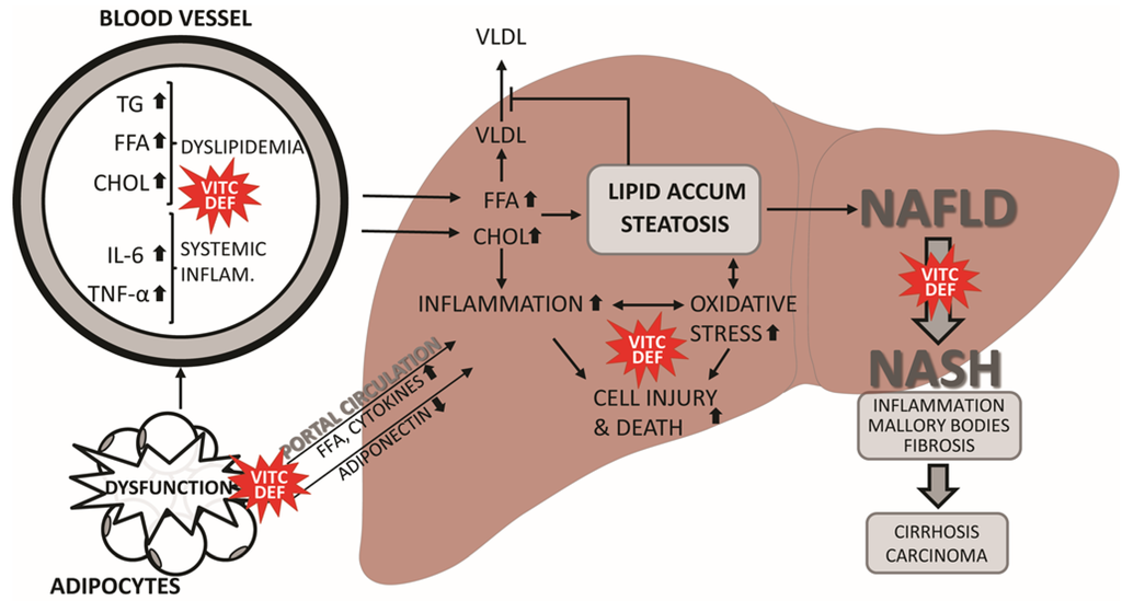 As co-factor for the 7α-hydroxylase, catalyzing the conversion of cholesterol to 7α-hydroxycholesterol, VitC deficiency may increase circulating levels of cholesterol (CHOL) by reducing its excretion through the bile. Systemic inflammation and dyslipidemia is propagated through adipocyte dysfunction, e.g., releasing fatty acids (FFA) and inflammatory cytokines to the blood stream. Moreover, by affecting adiponectin regulation, lack of VitC may further increase dyslipidemia, systemic inflammation and oxidative stress. As VitC is also a powerful antioxidant, deficiency per se promotes cellular oxidative stress, e.g., in the liver. The excess lipids induce mitochondrial dysfunction and stress of the endoplasmic reticulum (ER) further propagating hepatic oxidative stress and inflammation. FFA and CHOL is taken up by hepatocytes and processed to be exported from the liver by VLDL. When overloaded, hepatic VLDL export is saturated and lipids are accumulated in hepatocytes. Ultimately, NAFLD progression is driven by increased oxidative stress and inflammation, promoting activation of hepatic stellate and Kupffer cells, which alongside an increased hepatic production of TNFα, IL6, transforming growth factor β and collagen, amplifies the induction of cellular damage and fibrosis. Combined with key pathogenic changes taking place during the advancement from simple steatosis (NAFLD) to steatohepatitis (NASH), e.g., hepatocyte ballooning, formation of Mallory bodies and fibrosis, NASH may progress even further to hepatic cirrhosis and hepatocellular carcinoma.
