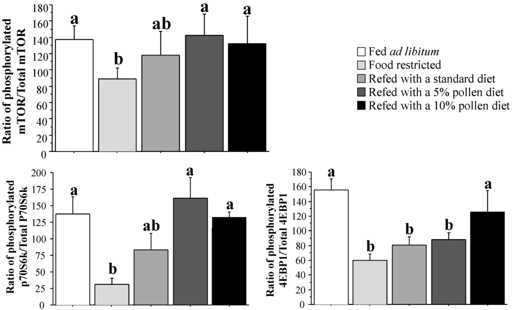 Regulation of the mTOR/p70S6k/4EBP1 signaling pathway after dietary restriction and refeeding with fresh pollen-containing diets in old rats.
