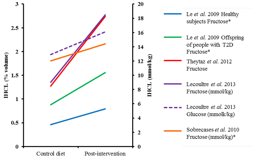 In order to determine causality between the associations found between fructose consumption and NAFLD, several dietary interventions have been undertaken. Over a short time period (6–7 days), fructose feeding of 3–3.5 g/kg/day (approximately 30%–35% of total energy intake) in solution in addition to a control diet has consistently been shown to increase intrahepatocellular lipid (IHCL) compared to the control diet alone, with changes ranging from 16% to 115% [15,96,97,98,99] (Figure 1, Table 1). However, most studies have administered fructose without an isocaloric comparator; therefore, it is unclear whether effects result from fructose per se or simply excessive energy consumption. In order to address these issues, Ngo Sock et al. performed a crossover study with a control diet alone, or in combination with 3.5 g/kg/day fructose or glucose [96]. When values at the end of each condition were compared, fructose resulted in a significant increase in IHCL (52%) compared to the control diet, but variation in response to glucose meant that the 58% increase noted after seven days was not significant. In contrast, a recent study showed that feeding 3 g/kg/d of either fructose or glucose over 6–7 days significantly increased IHCL compared to a control diet, and when expressed relative to control values and directly compared, the increase in liver fat after fructose ingestion was significantly higher than after glucose ingestion (113% vs. 59%) [99]. Therefore, although the available literature suggests ingesting large quantities of fructose hypercalorically over short time periods does enhance lipid storage, whether this is as a result of fructose metabolism itself or simply increased substrate supply is less clear.