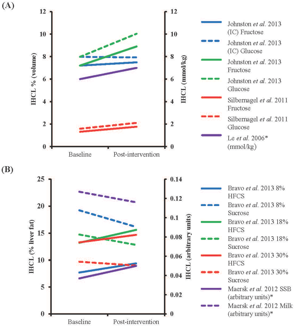 The effect of isocaloric (IC) and hypercaloric monosaccharide feeding on IHCL over more than seven days. (A) Changes in interventions using fructose and/or glucose. Interventions were hypercaloric unless otherwise stated (B) Changes in interventions using alternative fructose-containing solutions and comparators (Bravo et al. [104]; isocaloric high-fructose corn syrup (HFCS) vs. sucrose, Maersk et al. [103]; hypercaloric sucrose-sweetened beverage (SSB) vs. milk). * Values estimated from figures, IHCL; intrahepatocellular lipid.