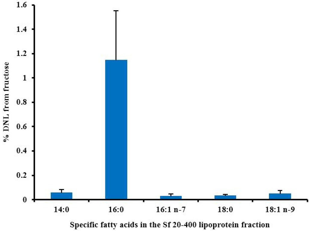 The % of individual fatty acids (±SEM) that have arisen by DNL 4 h after healthy subjects consumed 0.75 g fructose/kg body weight (9% of energy requirement) as part of a mixed liquid meal. Calculated from data collected for Chong et al. [110].