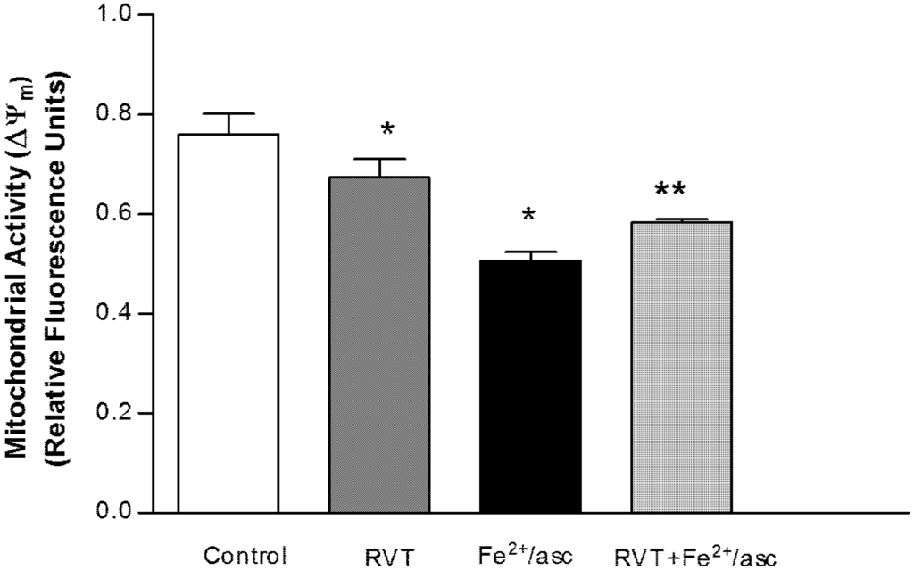 Effect of RVT on Δψm. Spermatozoa were obtained from ductus deferens in M-16 medium, pooled and incubated with RVT, Fe2+/asc or RVT + Fe2+/asc. Δψm was determined using the Mito ProbeJC-1 assay kit and the fluorescence was measured on a spectrofluorometer. Values represent the mean ± SD of three independent experiments performed in duplicate. * p < 0.05 vs. control group. ** p < 0.05 vs. Fe2+/asc group.