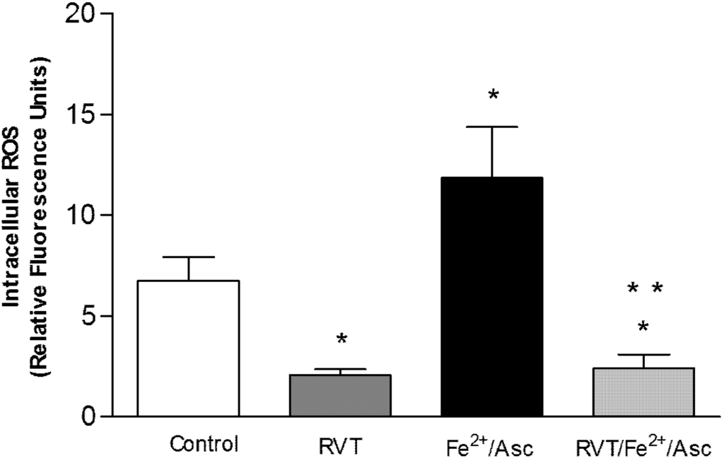 Effect of RVT treatment on intracellular ROS levels. Spermatozoa were obtained from ductus deferens in M-16 medium, pooled and incubated with RVT, Fe2+/asc or RVT + Fe2+/asc. ROS levels were evaluated using the CM-H2DCFDA reagent. Fluorescence was measured in a spectrofluorometer. Values represent the mean ± SD of three independent experiments performed in duplicate. * p < 0.001 vs. control group. ** p < 0.001 vs. Fe2+/asc group.