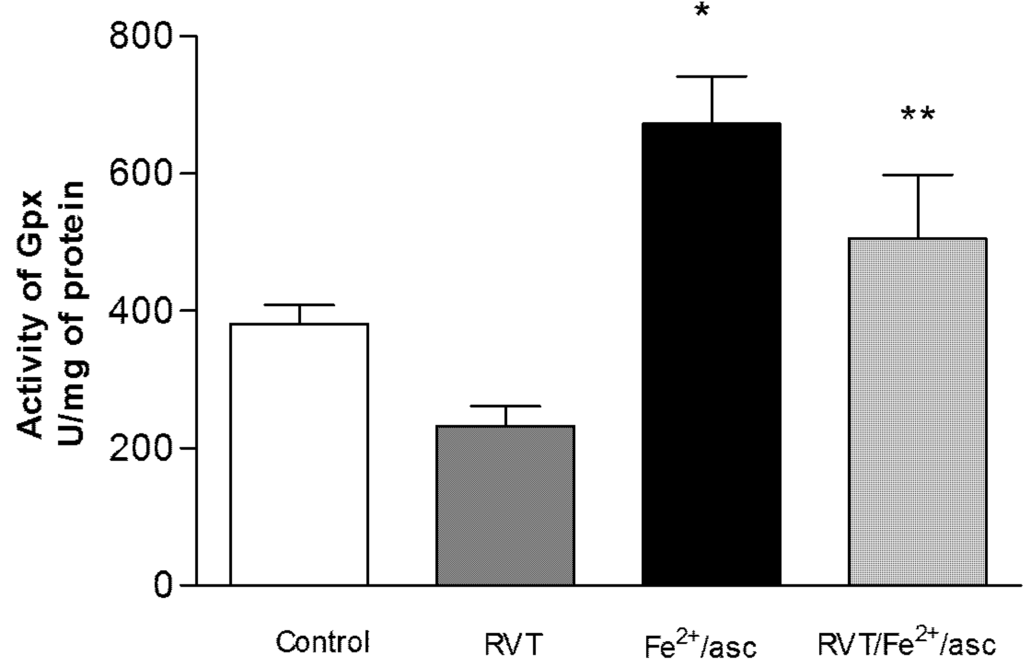Effect of RVT on GPX activity. Spermatozoa were obtained from ductus deferens in M-16 medium, pooled and incubated with RVT, Fe2+/asc or RVT + Fe2+/asc. Activity of GPX was measured with a spectrophotometer after using the RANSEL assay kit. Values represent the mean ± SD of three independent experiments performed in duplicate. * p < 0.05 vs. control group. ** p < 0.05 vs. Fe2+/asc group.