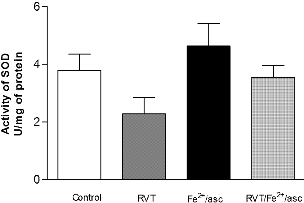 On the other hand, we did not find any significant difference in SOD activity with RVT pretreatment. SOD catalyzes the dismutation of O2− into oxygen and hydrogen peroxide. The lack of difference with and without RVT pretreatment may be due to the fact that the pro-oxidant ferrous iron/ascorbate generates the hydroxyl radical through the Haber-Weiss or Fenton reaction [40].