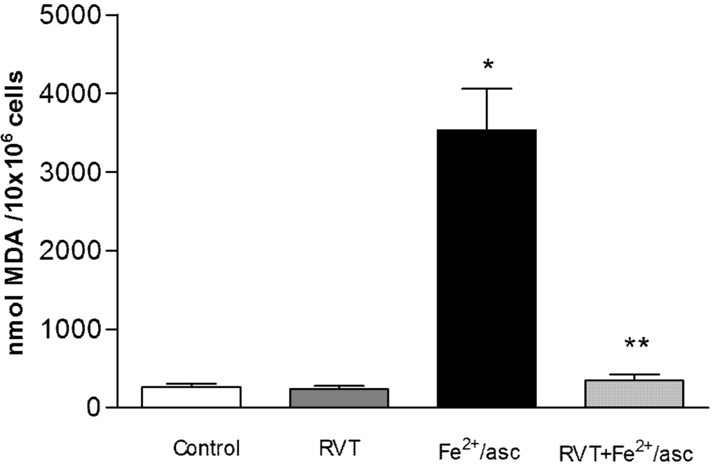 Effect of RVT on lipid peroxidation. Spermatozoa were obtained from ductus deferens in M-16 medium, pooled and incubated with RVT, Fe2+/asc or RVT + Fe2+/asc. Lipid peroxidation was measured with a spectrophotometer using the TBARS method. Values are the mean ± SD of three independent experiments performed in duplicate. * p < 0.001 vs. control group. ** p < 0.001 vs. Fe2+/asc group.