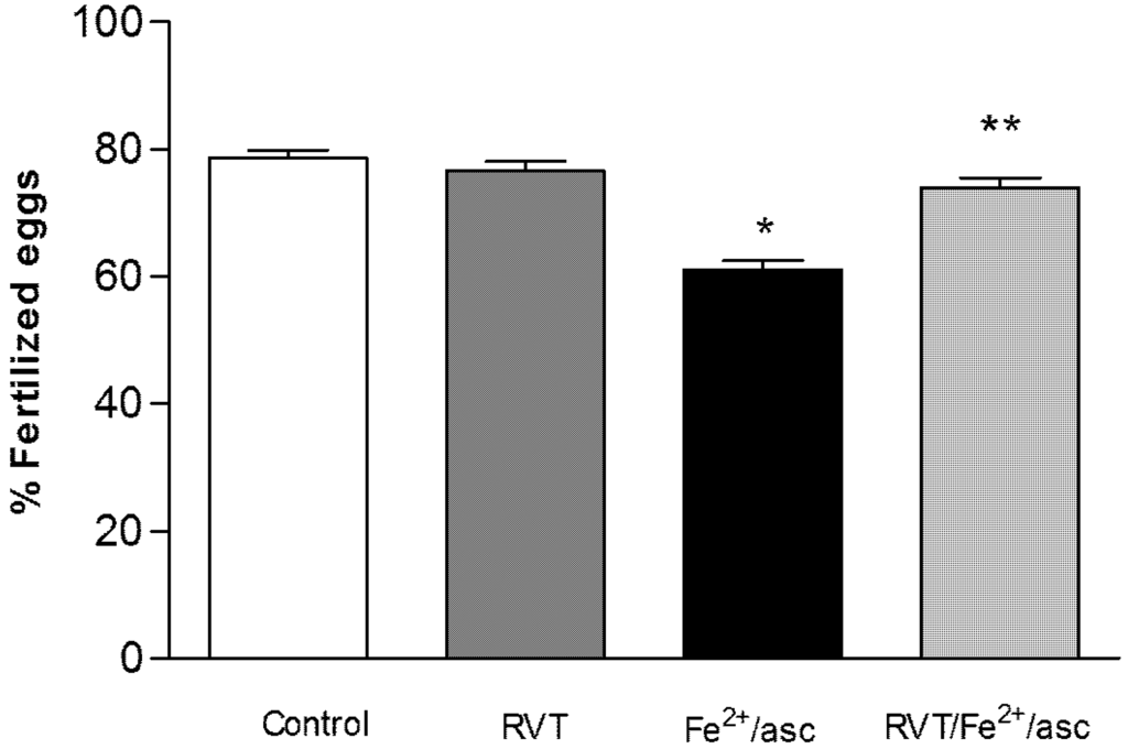Effect of RVT on IVF capability. Spermatozoa from the different groups were incubated with eggs during 24 h at 37 °C in an incubator under an atmosphere of 5% CO2/95% air. Eggs with 2 to 6 cells were considered fertilized. Values represent the mean ± SD of three independent experiments performed in duplicate. * p < 0.001 vs. control group. ** p < 0.001 vs. Fe2+/asc group.