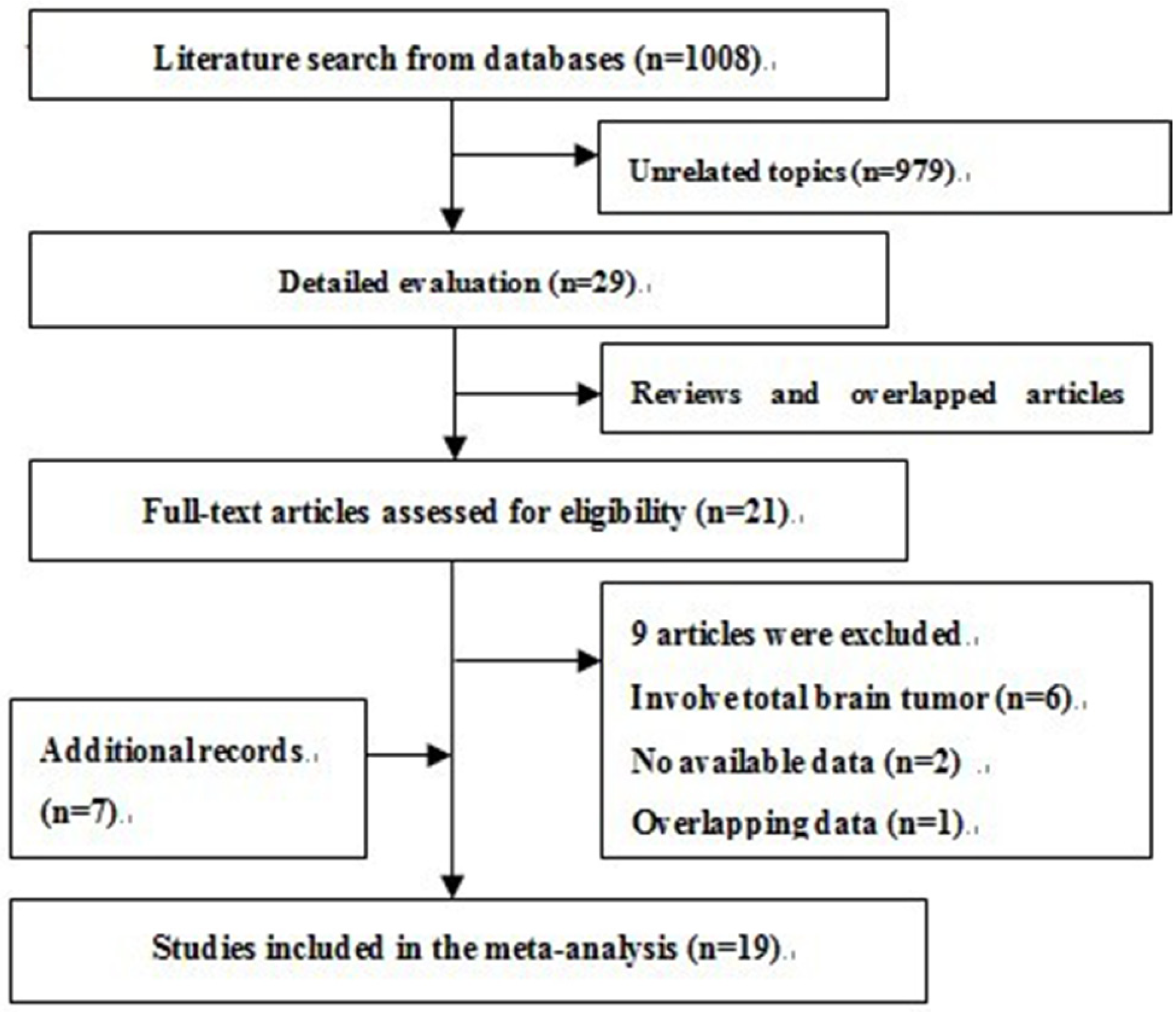 We adopted the following inclusion criteria: (1) a study of any alcohol consumption and glioma; (2) case-control or cohort design; (3) estimates of relative risk (odd ratio (OR), hazard ratio (HR), rate ratio) with corresponding 95% CIs were provided (or enough data to calculate them); (4) when more than one report based on the same study population was published, only the most comprehensive publication was included in this meta-analysis; (5) we excluded the studies which concerned total brain tumors or central nervous system (CNS) tumors in their subjects because total brain tumors or CNS tumors contain other types of tumors (i.e., meningioma, pituitary adenomas, neurilemmomas), which differ from glioma in a pathological and clinical point of view; and (6) we also precluded the studies which involved childhood glioma in relation to consumption of any alcohol by the mother.
