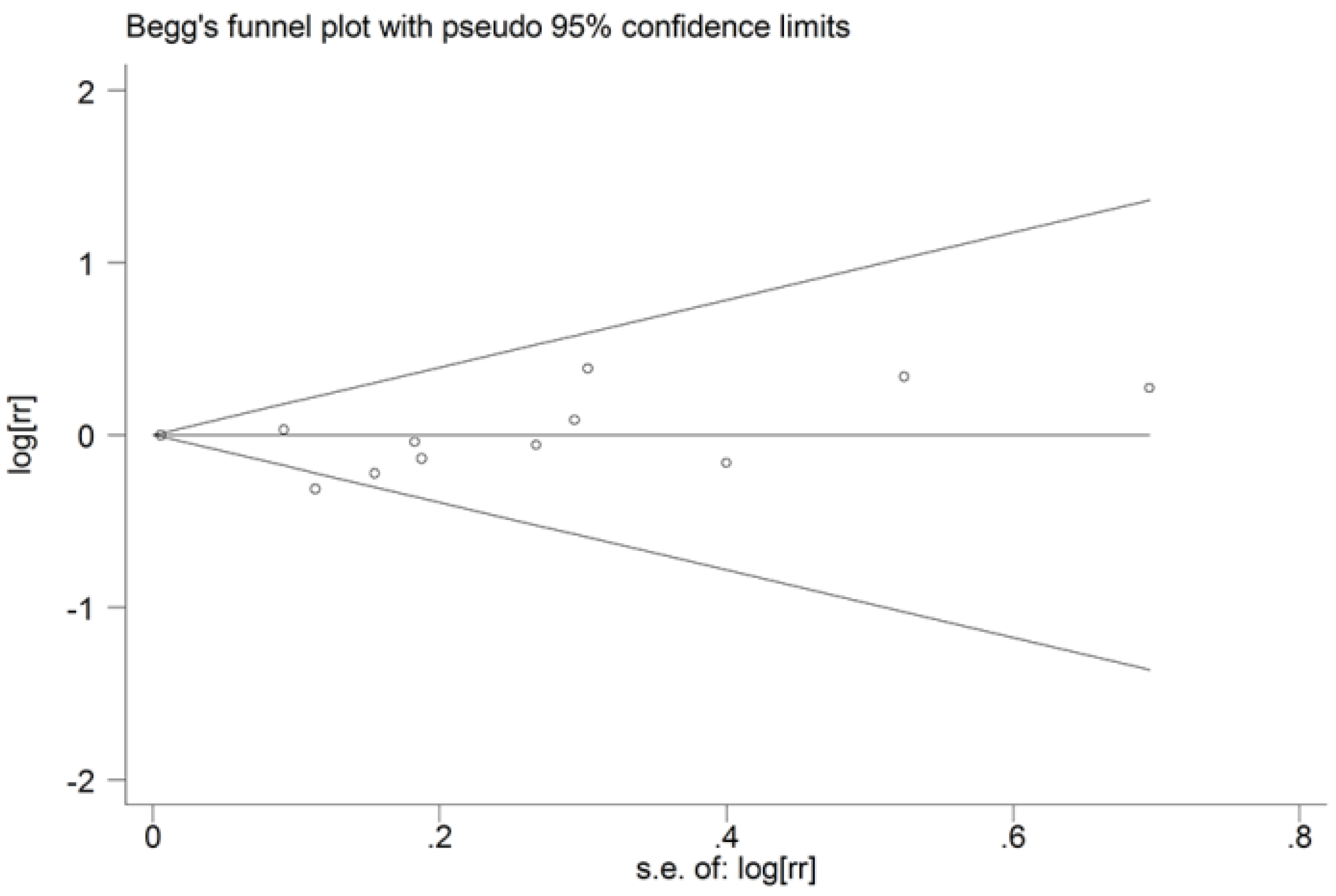 We performed a sensitivity analysis to evaluate the influence of individual study on the overall results by omitting one study each turn. The results of sensitivity analysis were not meaningfully altered (data not shown). The Begg’s funnel plot does not show any asymmetry (Figure 4), indicating that no evidence of publication bias were detected. Also, the Egger’s test suggested there is no publication bias (p for Egger’s test = 0.465).